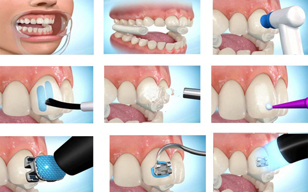 - Закрепляются кронштейны. Все элементы пронумерованы в соответствии с зубами, на которых будут устанавливаться. Врач закрепляет кронштейны на поверхности эмали, после чего убирает лишний клей и засвечивает конструкцию специально ультрафиолетовой лампой.