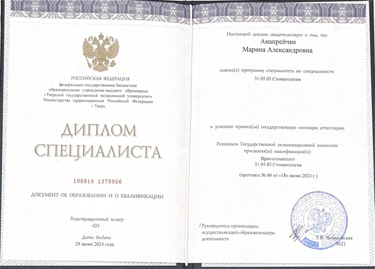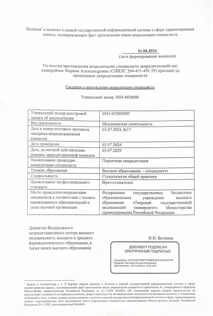 1. Стоматология общей практики (уникальный номер реестровой записи об аккредитации 6924 032005095) до 11.07.2028г.Специализация: