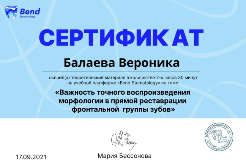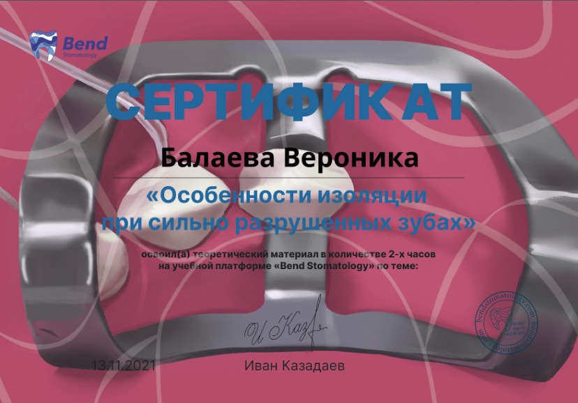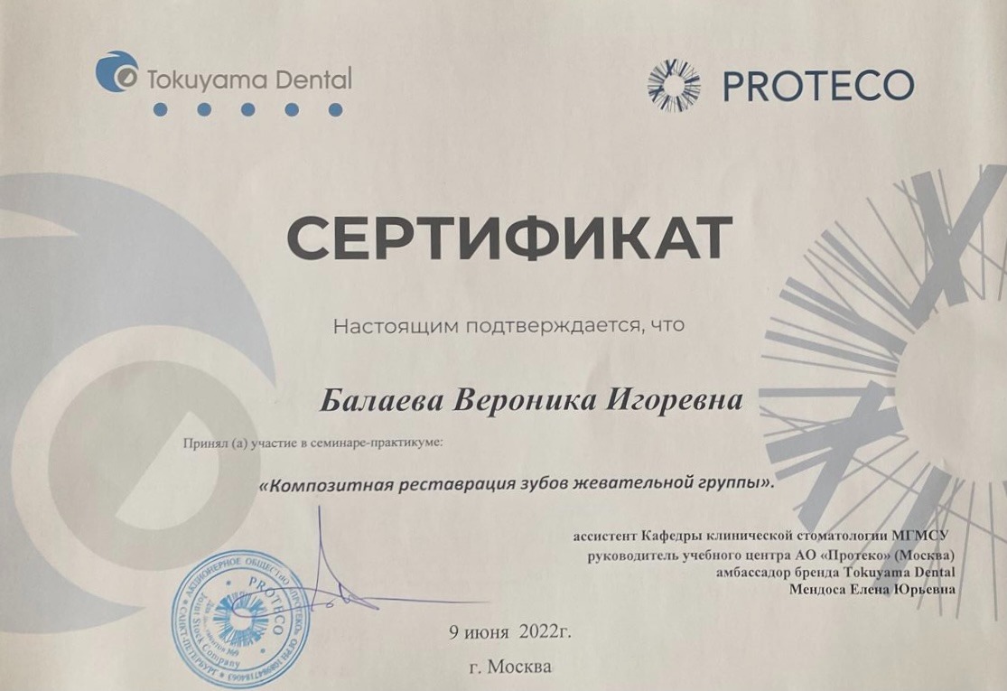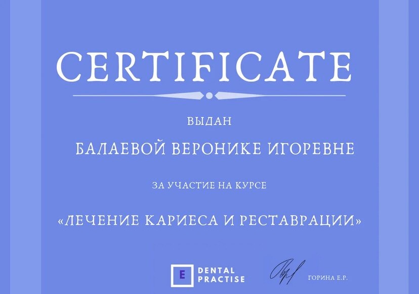 МГМСУ им. А. И. Евдокимова специальность врач-стоматолог общей практики (2020г.) Ординатура МГМСУ им. А.И. Евдокимова специальность врач стоматолог-терапевт (2022г.)Профессиональные навыки