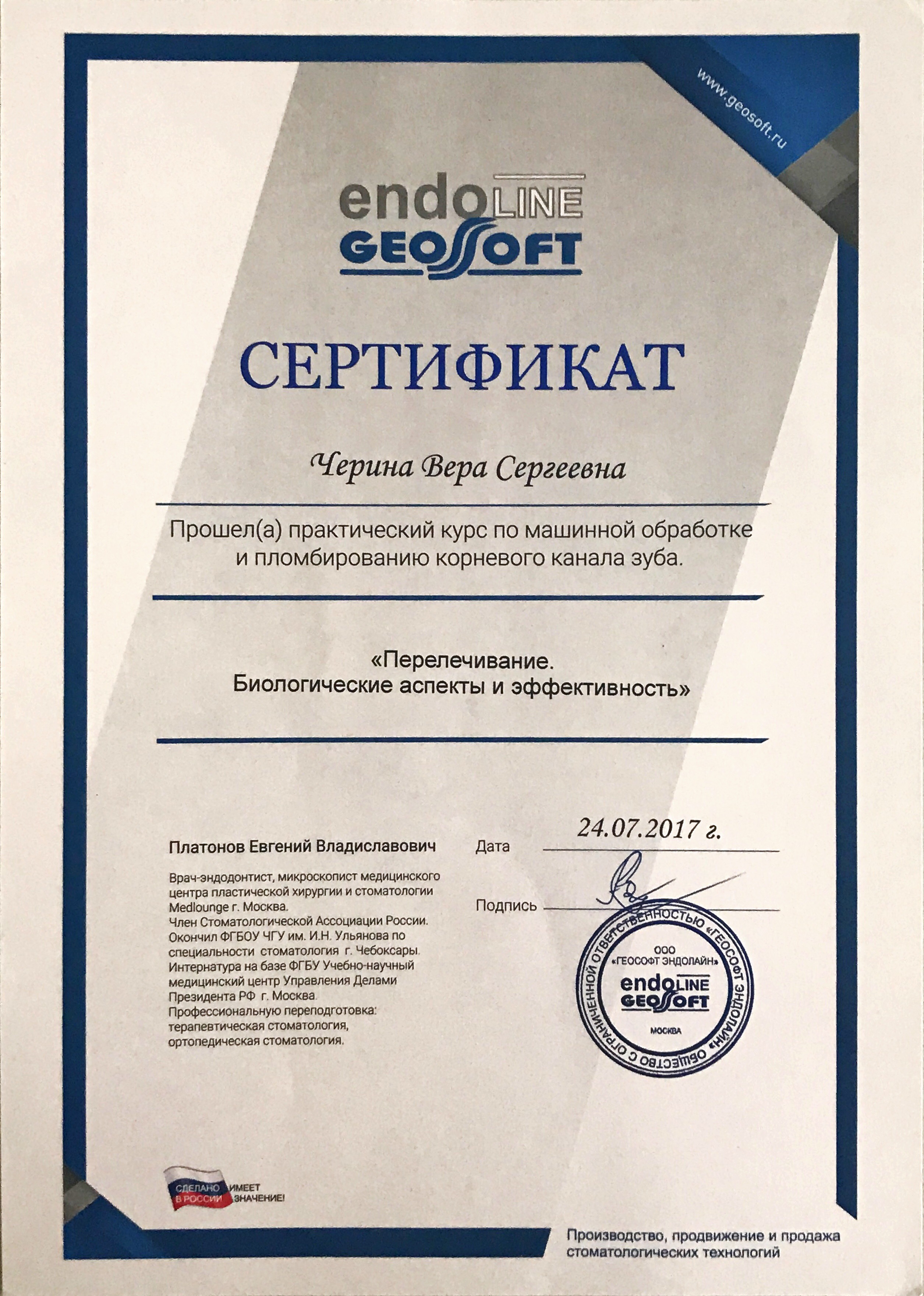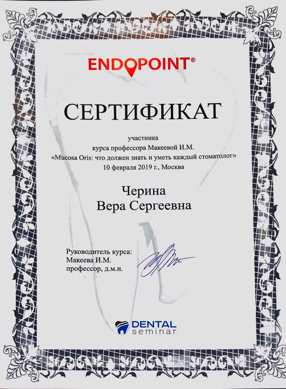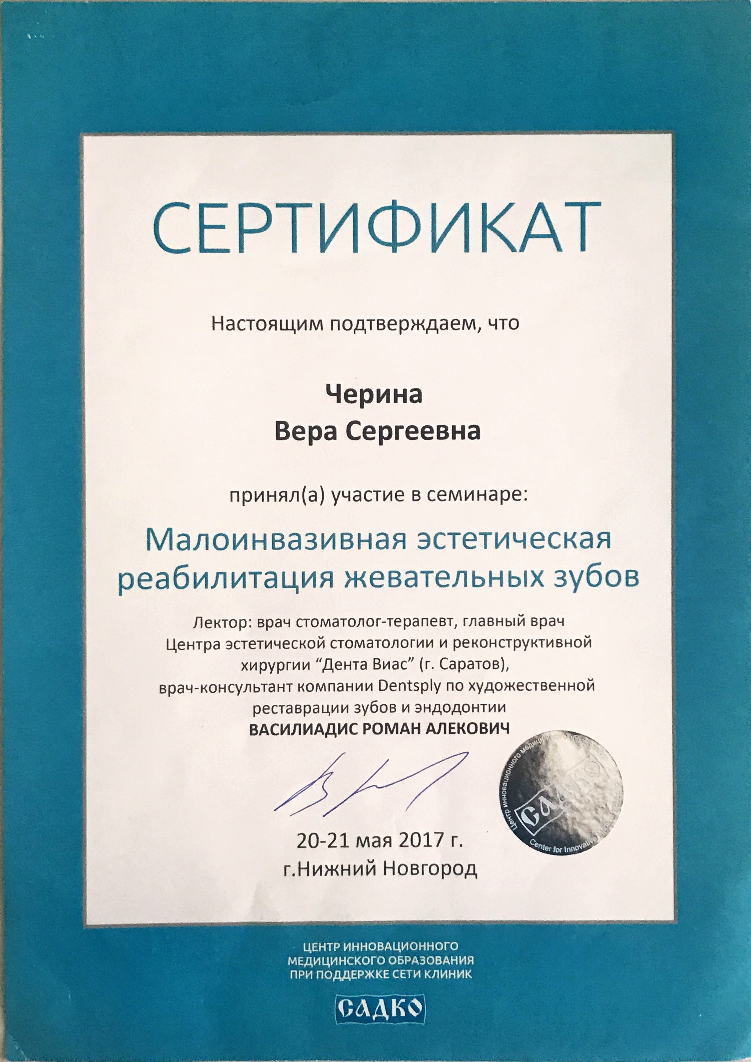 2015 г. – Курс по специальности: терапевтическая стоматология. 2019 — Курс профессора Макеевой И. М. «Mucosa Oris: Что должен знать и уметь каждый стоматолог»Профессиональные навыки: