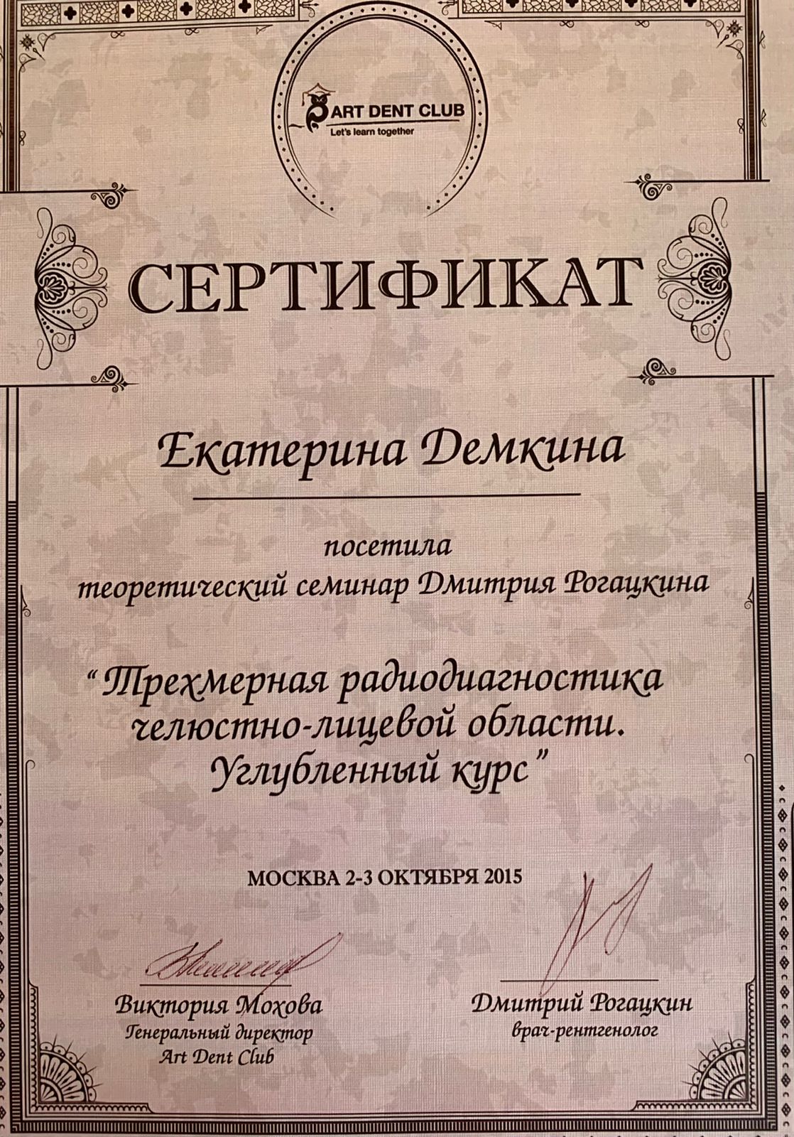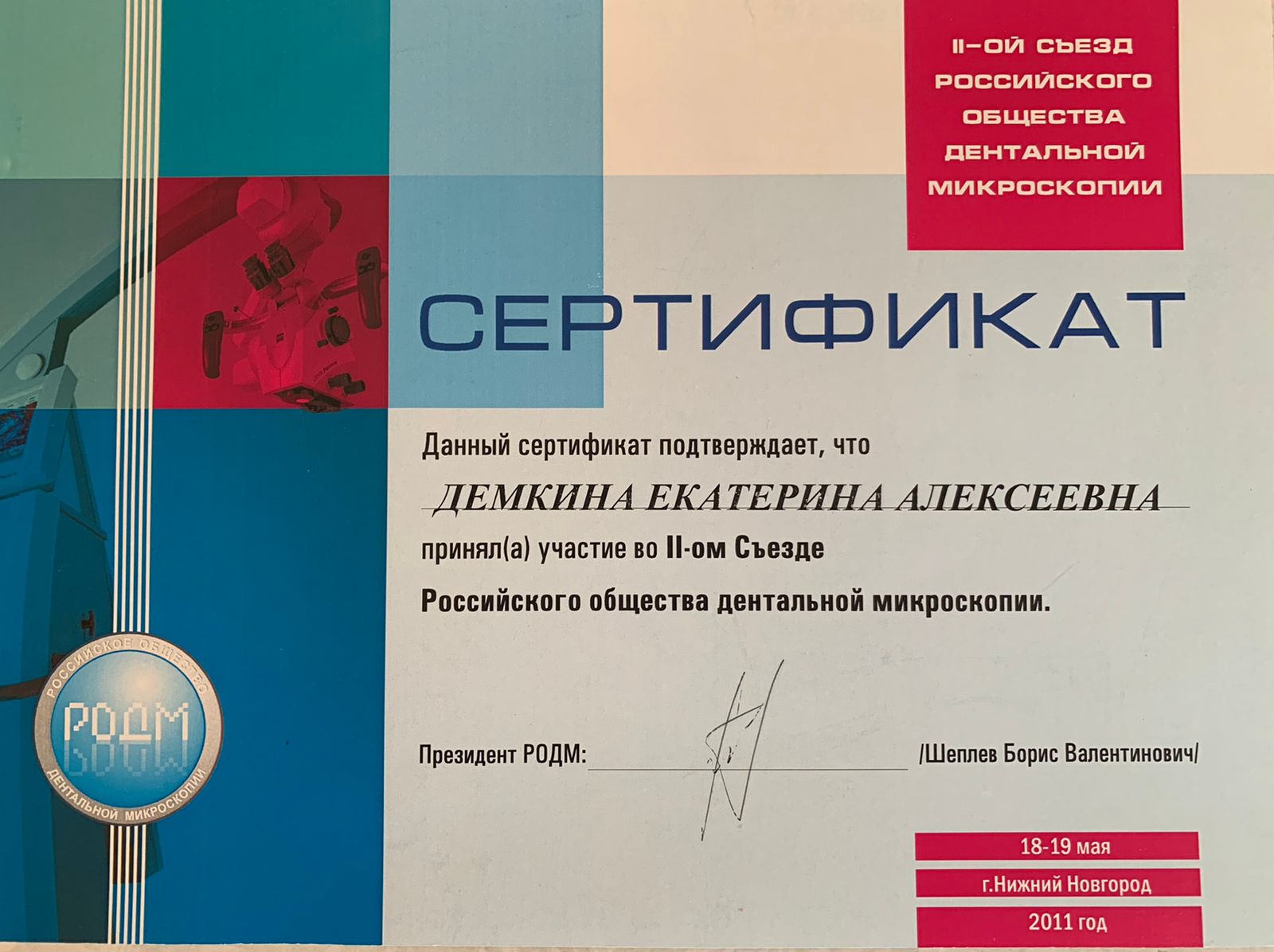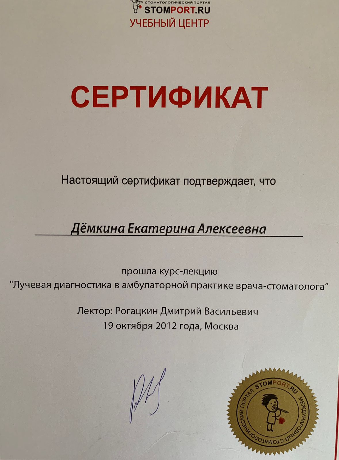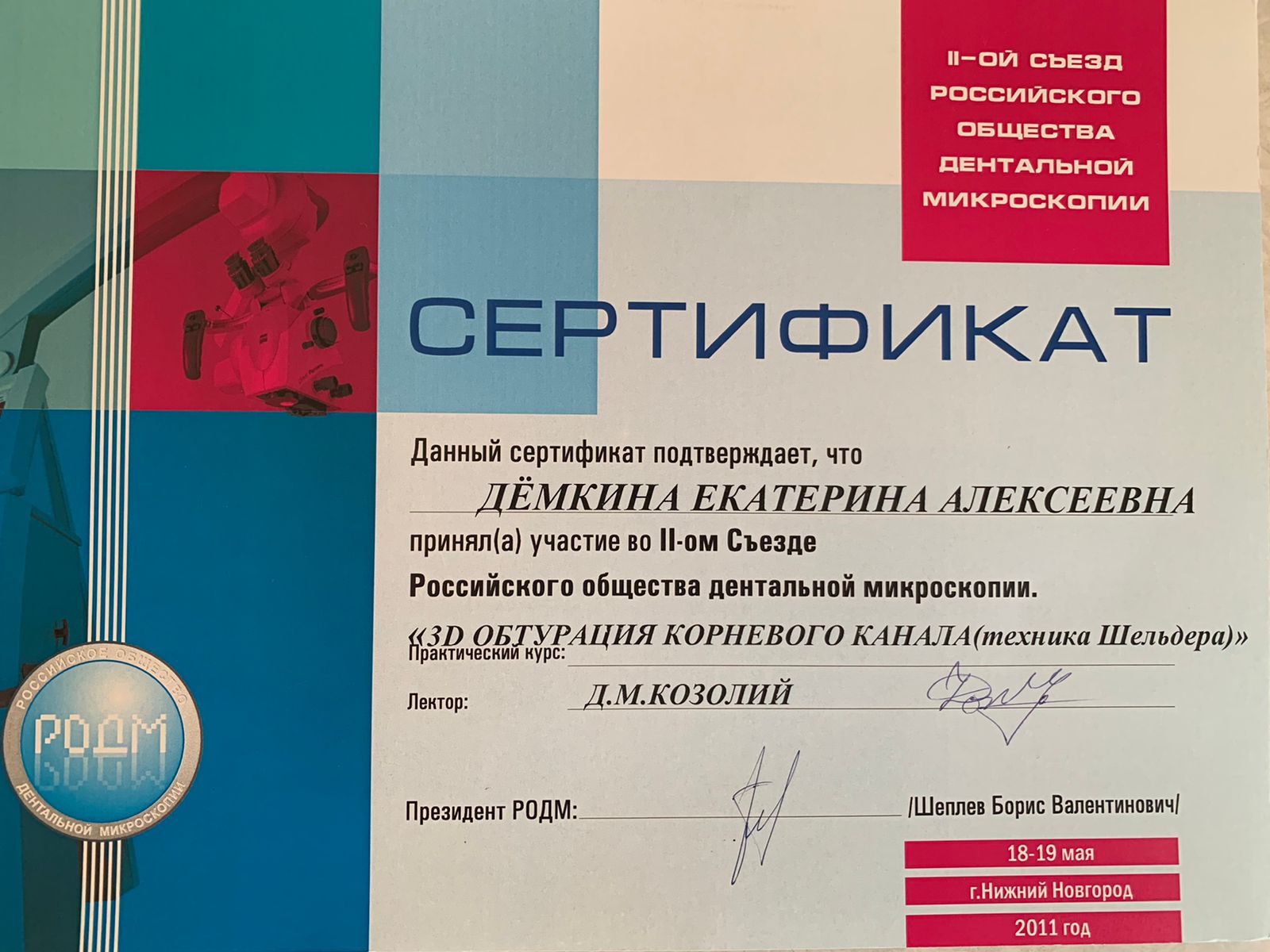 Тверская государственная медицинская академия (2006г.) Профессиональная переподготовка по специальности «Стоматология терапевтическая» Межрегиональный центр подготовки медицинских кадров (2019 г.) Профессиональная переподготовка по специальности «Стоматология» ортопедическая» МГМСУ имени А. И. Евдокимова, Стоматология ортопедическая (2015 г.)Профессиональные навыки