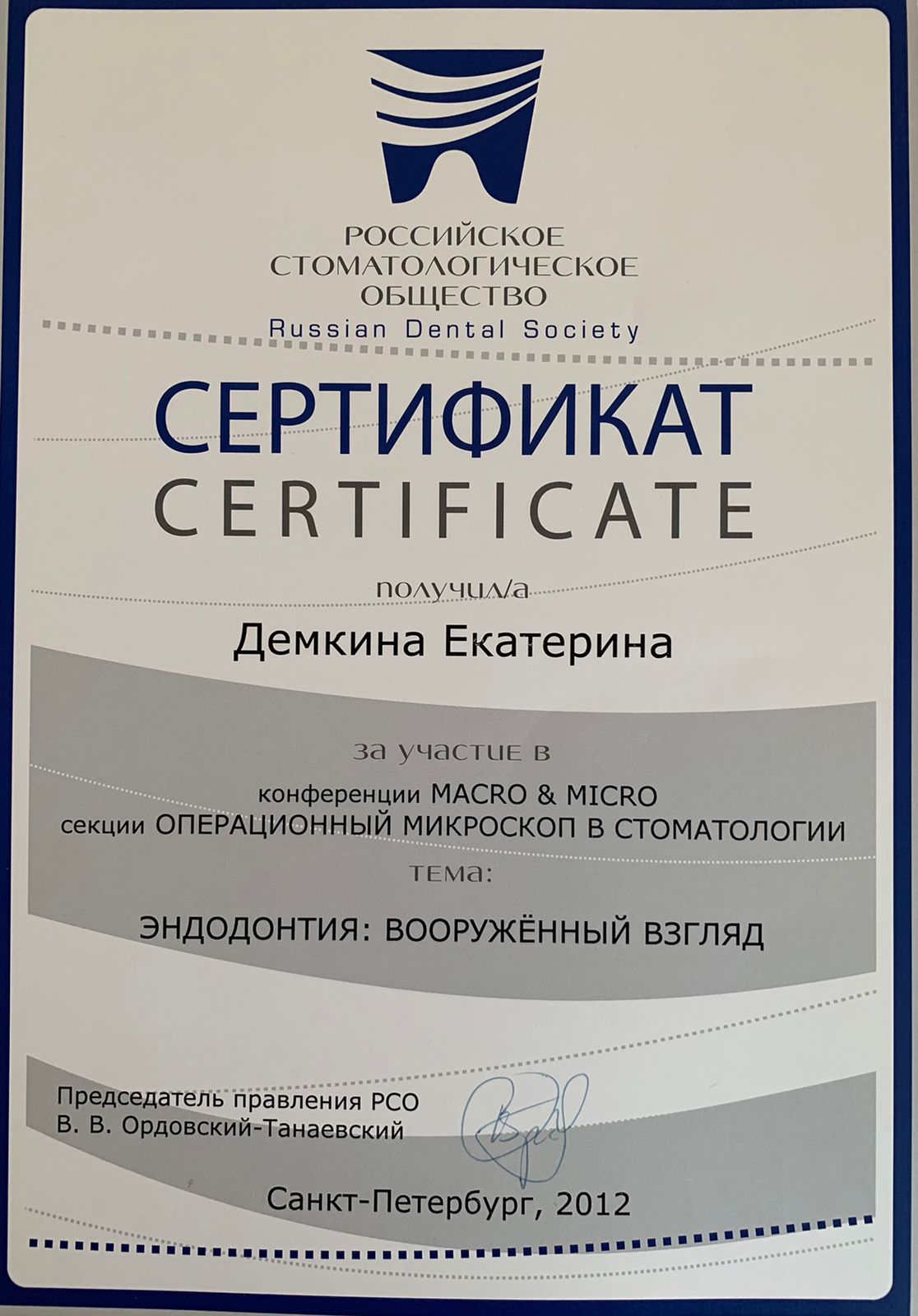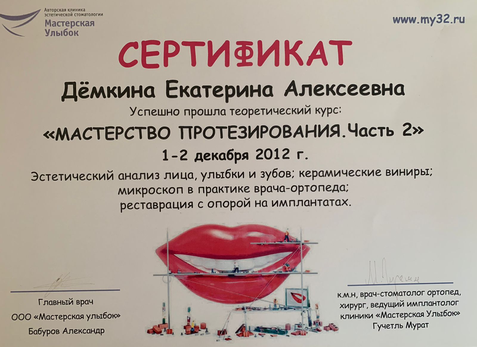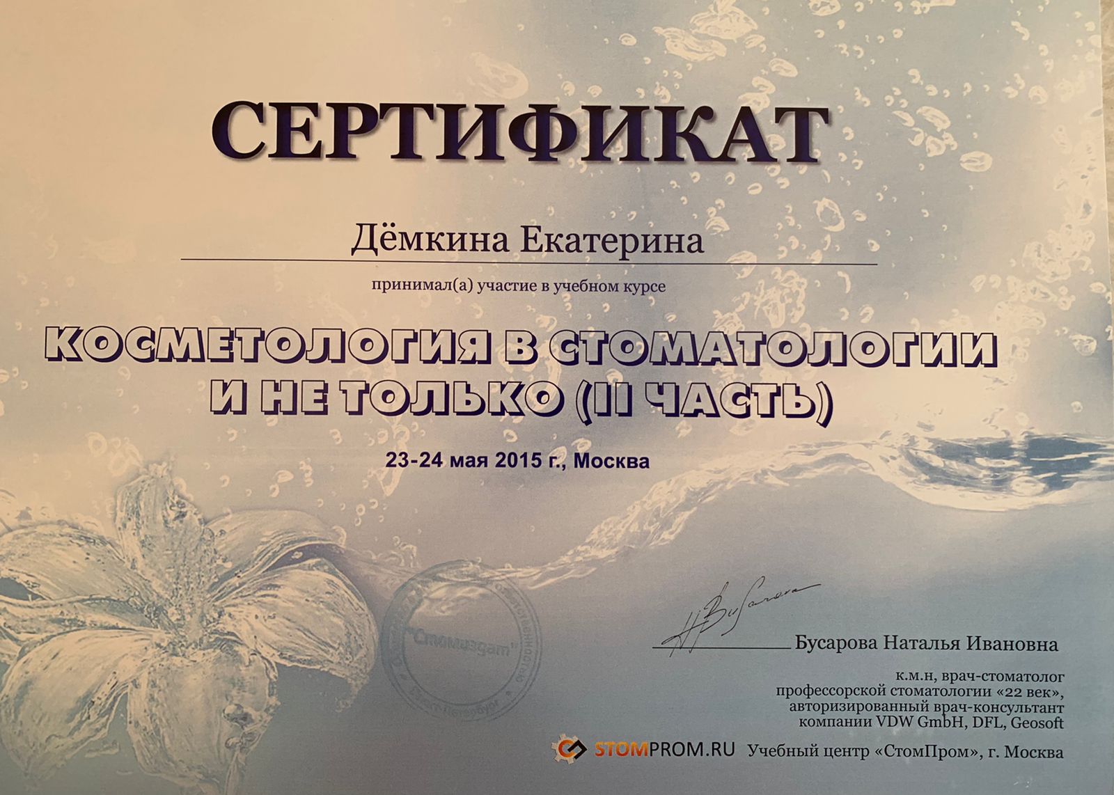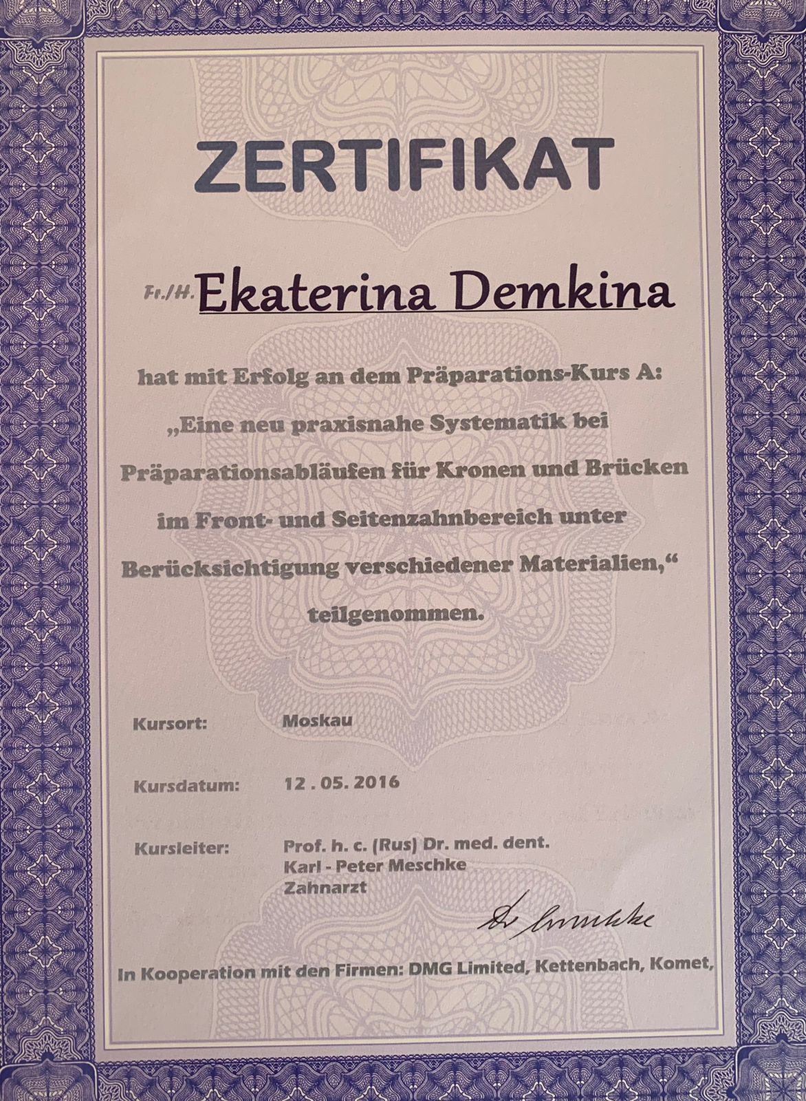Тверская государственная медицинская академия (2006г.) Профессиональная переподготовка по специальности «Стоматология терапевтическая» Межрегиональный центр подготовки медицинских кадров (2019 г.) Профессиональная переподготовка по специальности «Стоматология» ортопедическая» МГМСУ имени А. И. Евдокимова, Стоматология ортопедическая (2015 г.)Профессиональные навыки