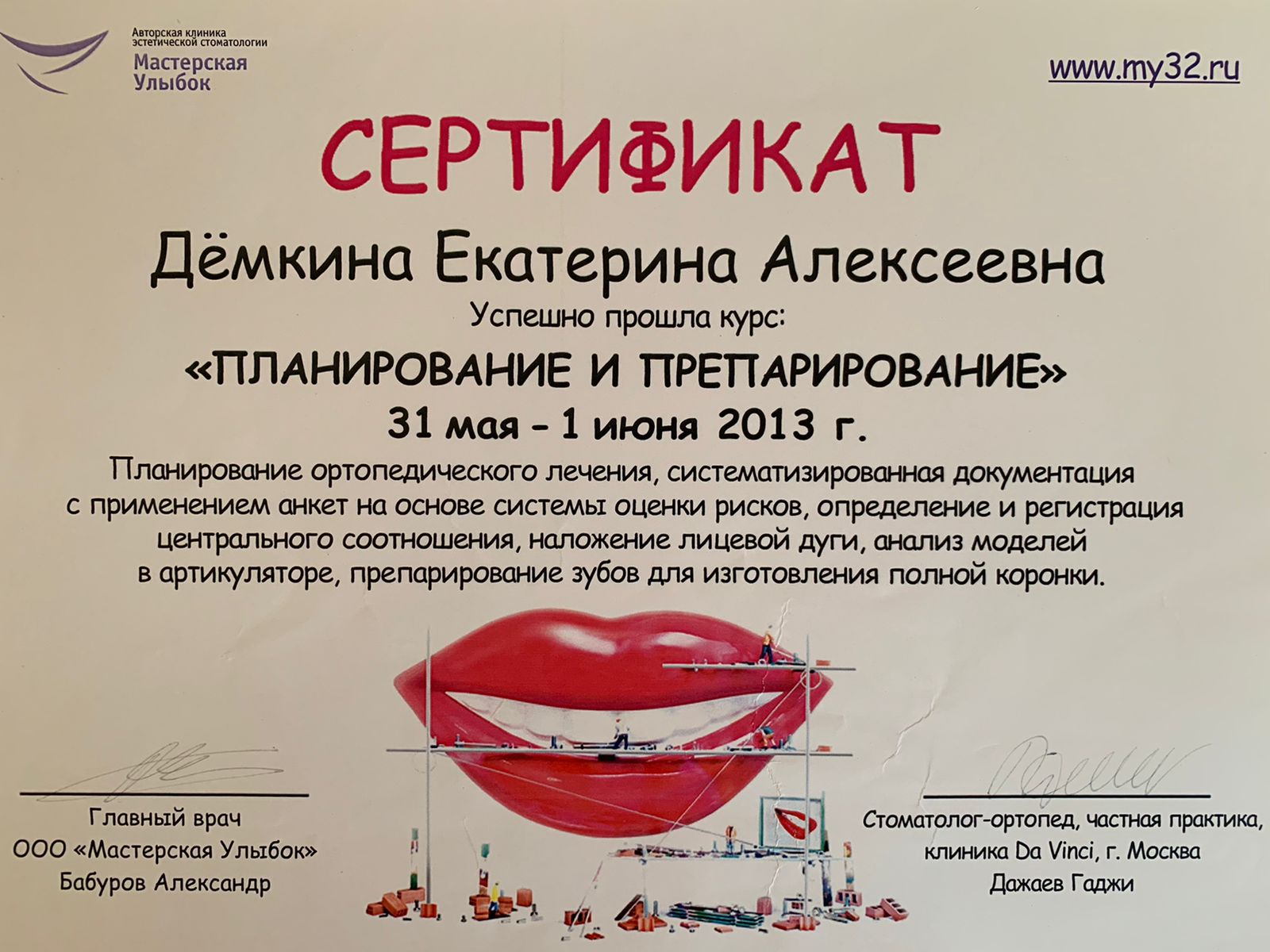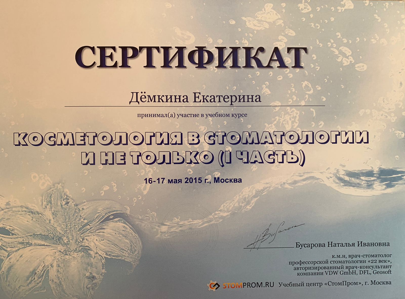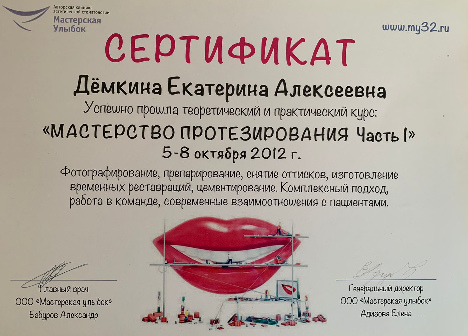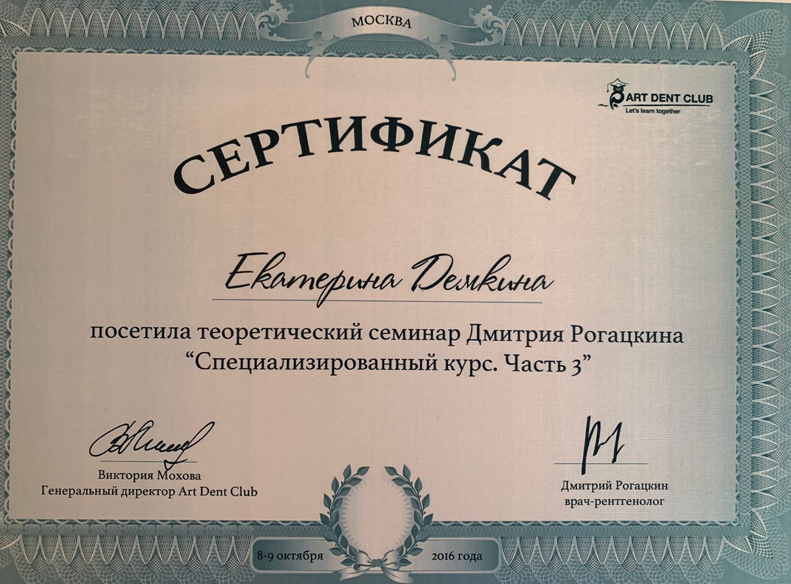 Тверская государственная медицинская академия (2006г.) Профессиональная переподготовка по специальности «Стоматология терапевтическая» Межрегиональный центр подготовки медицинских кадров (2019 г.) Профессиональная переподготовка по специальности «Стоматология» ортопедическая» МГМСУ имени А. И. Евдокимова, Стоматология ортопедическая (2015 г.)Профессиональные навыки