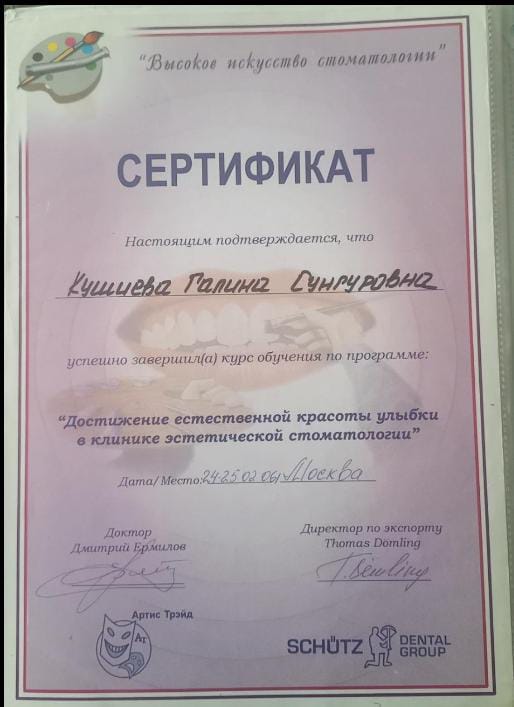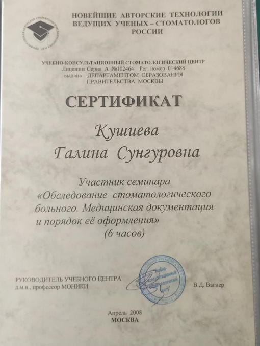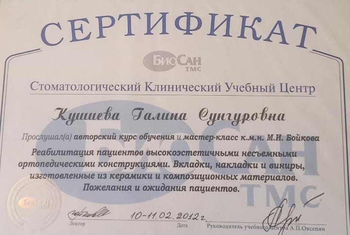 - Прослушала курс лекций «Новейшие авторские технологии ведущих ученых-стоматологов России»;