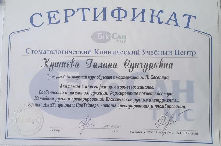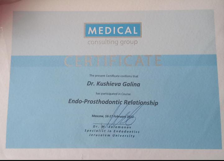 - Повышение квалификации на факультете усовершенствования врачей МОНИКИ по специальности «Новые технологии современной эндодонтии и кариесологии»;