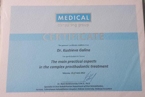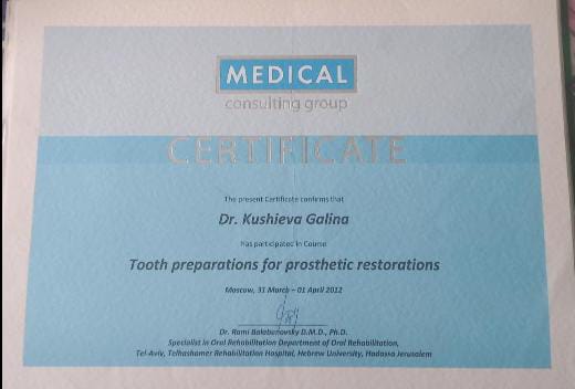 - Прослушала двухдневный курс Dr.Rami Balabanovsky(МедикалКонсалтинг Москва2012)_Препарирование зубов под различные виды конструкций;