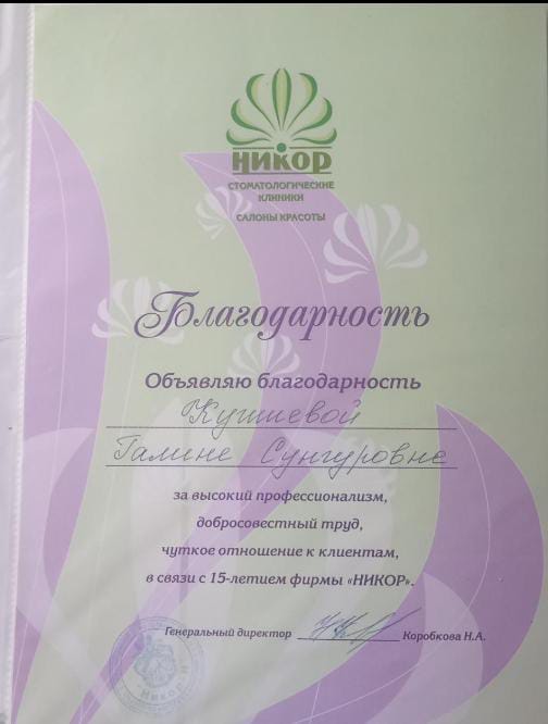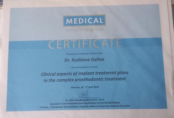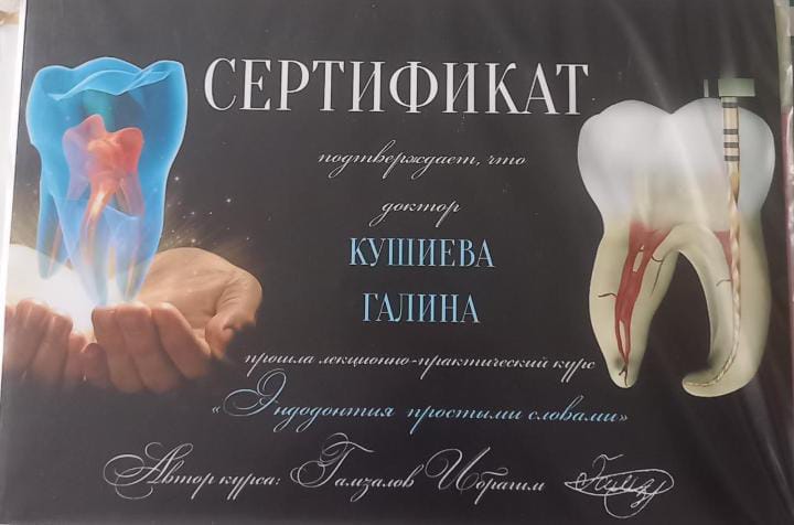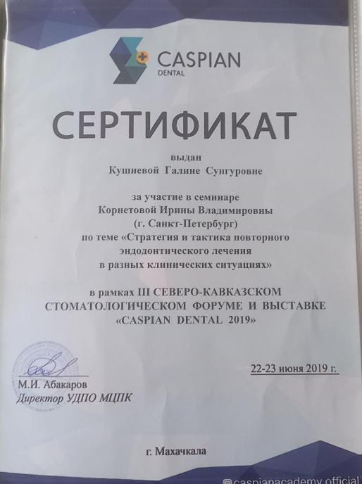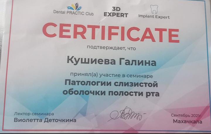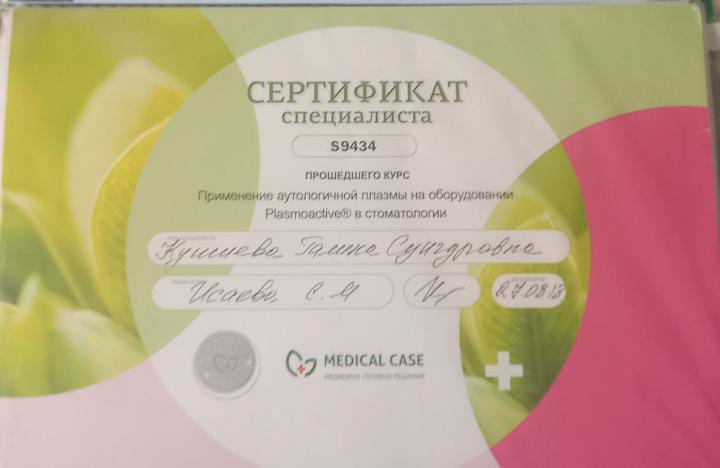 - Прошла курс по применению аутологичной плазмы в стоматологии,на оборудовании Рlasmoactive.(Махачкала 2018);