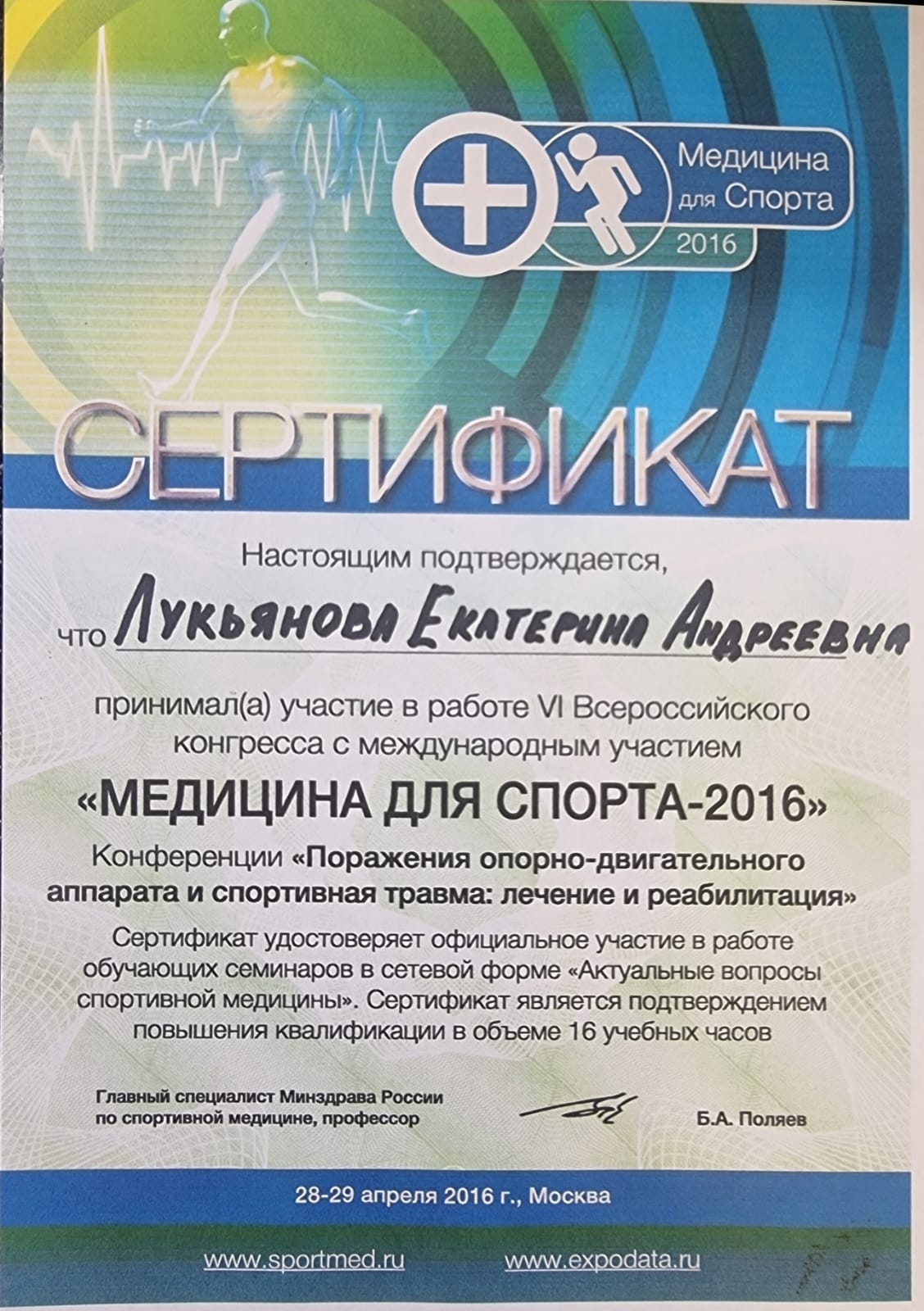 2016-Принимала участие в работе VI Всероссийского конгресса с международным участием»Медицина для спорта «