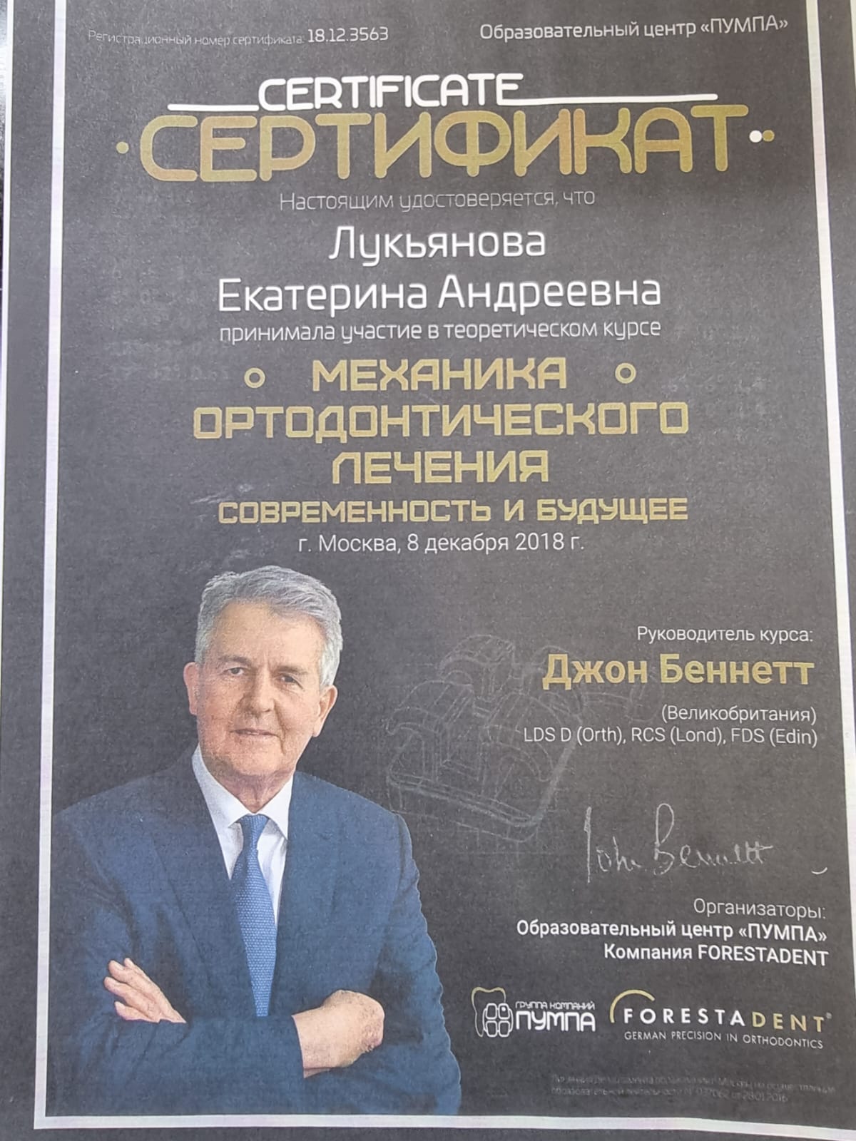 2018-Прошла курс Джона Беннетта(Великобритания)»Механика ортодонтического лечения»