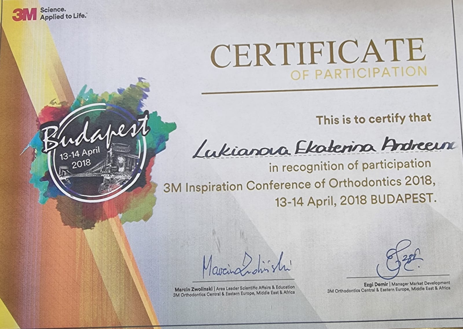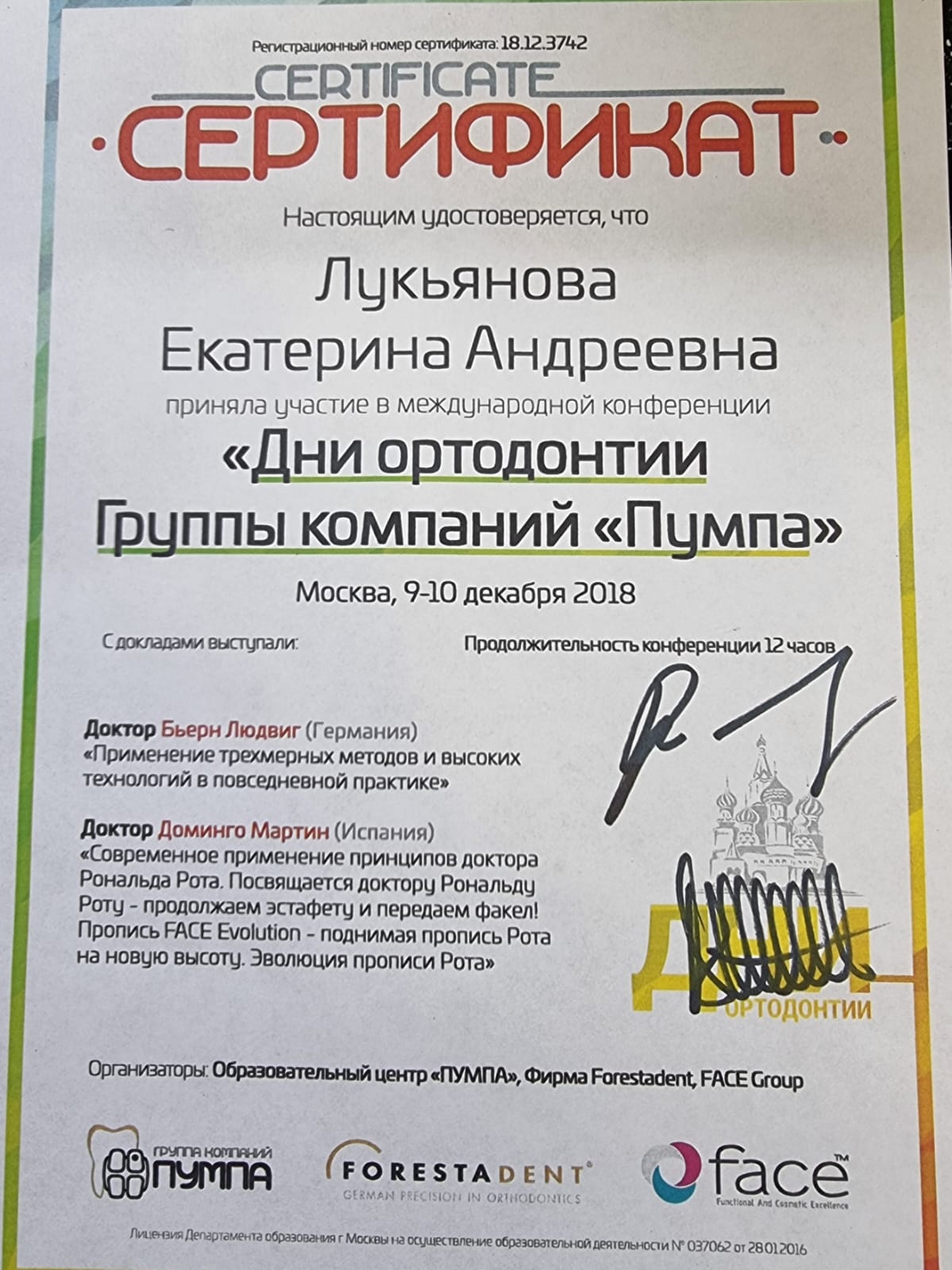 2018-Принимала участие «Дни ортодонтии с участием Бьерн Людвига(Германия)и Доминго Мартин(Испания)