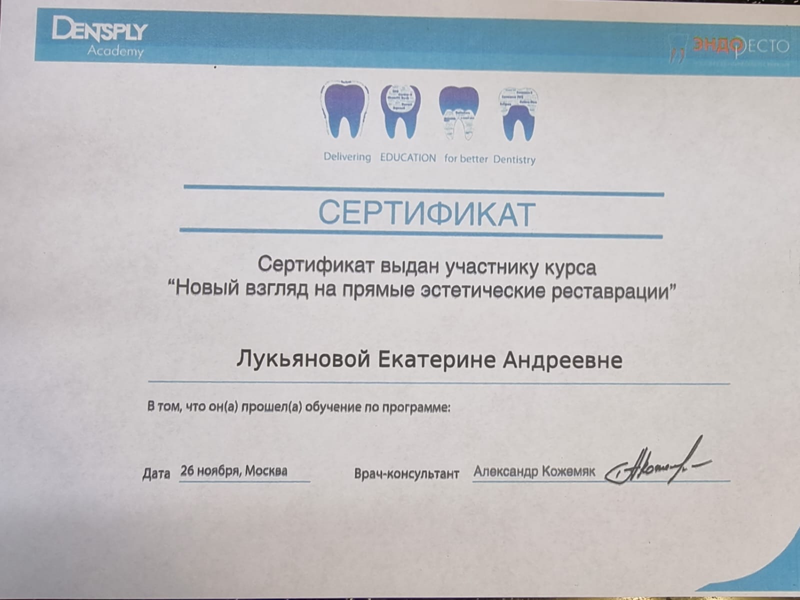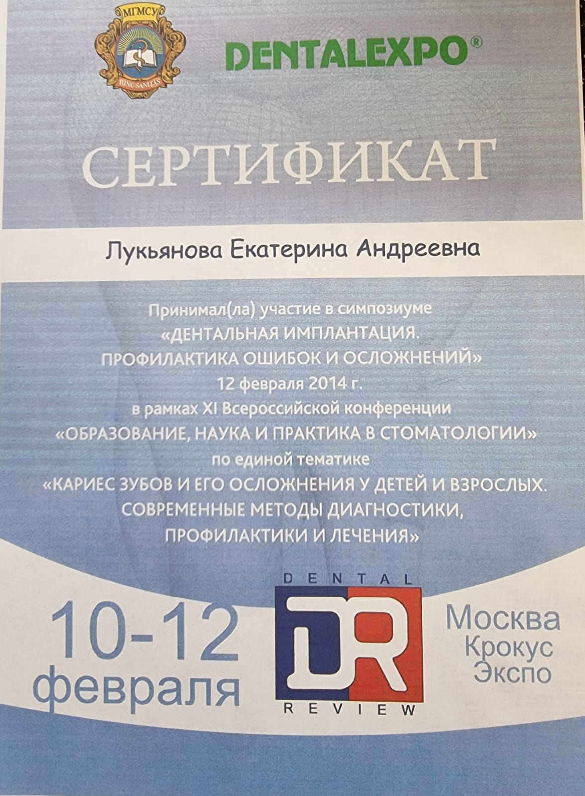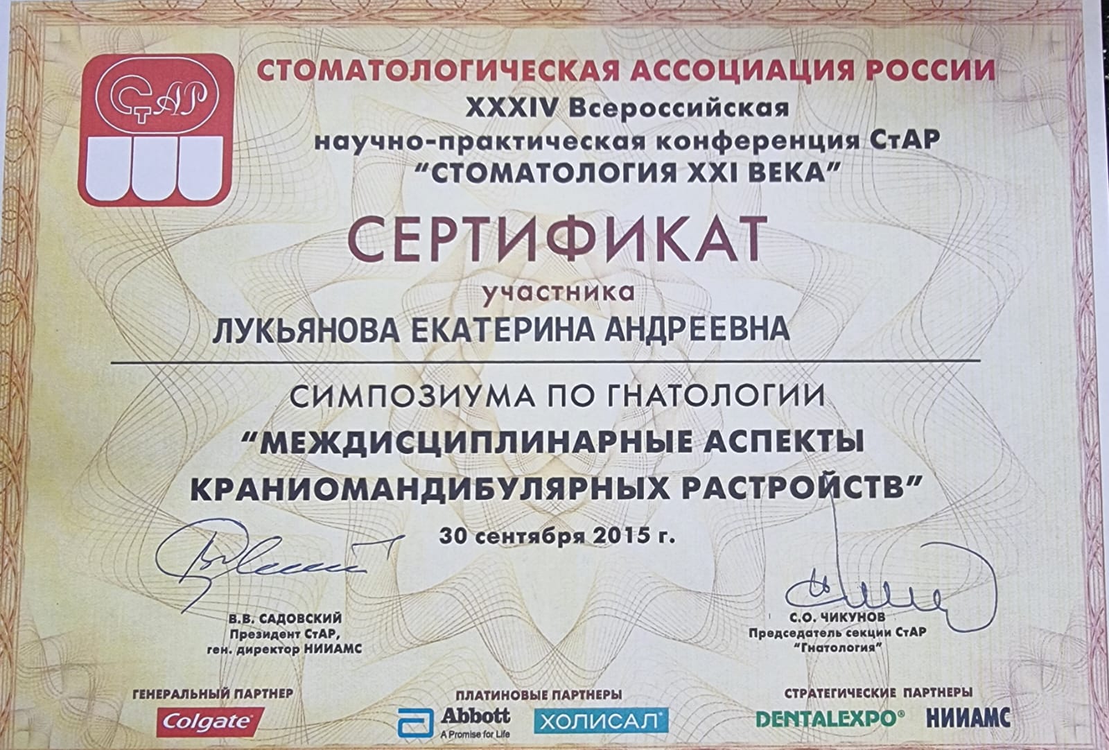 2015-Сертификат «Кариес зубов и его осложнения у детей и взрослых.