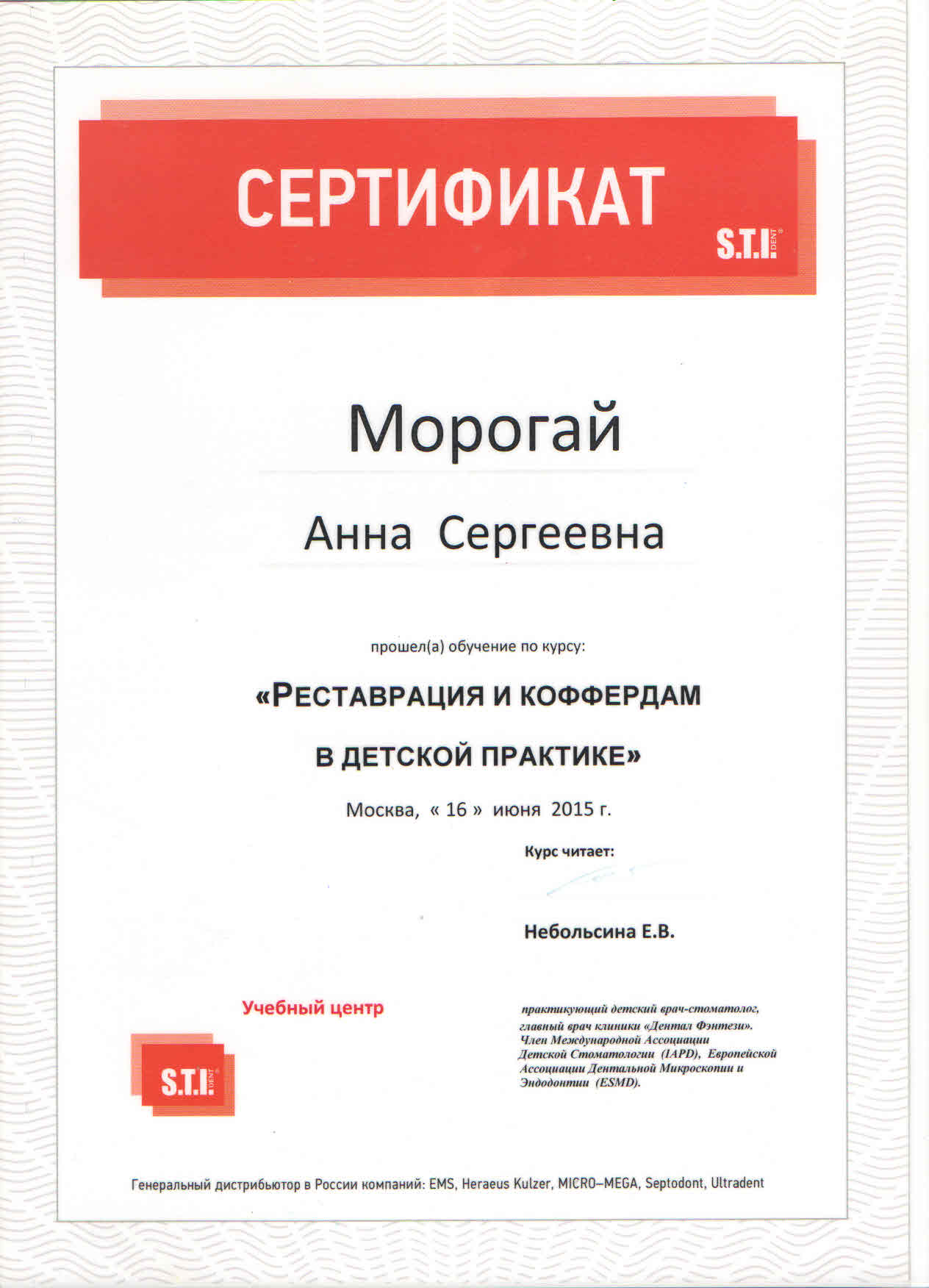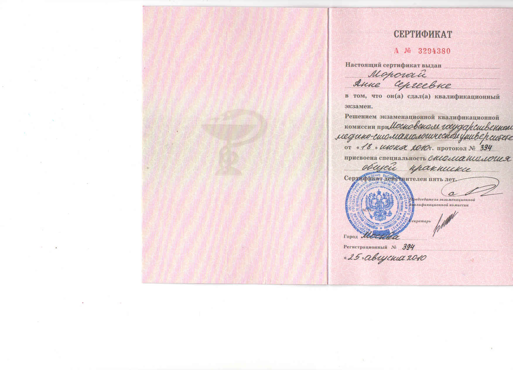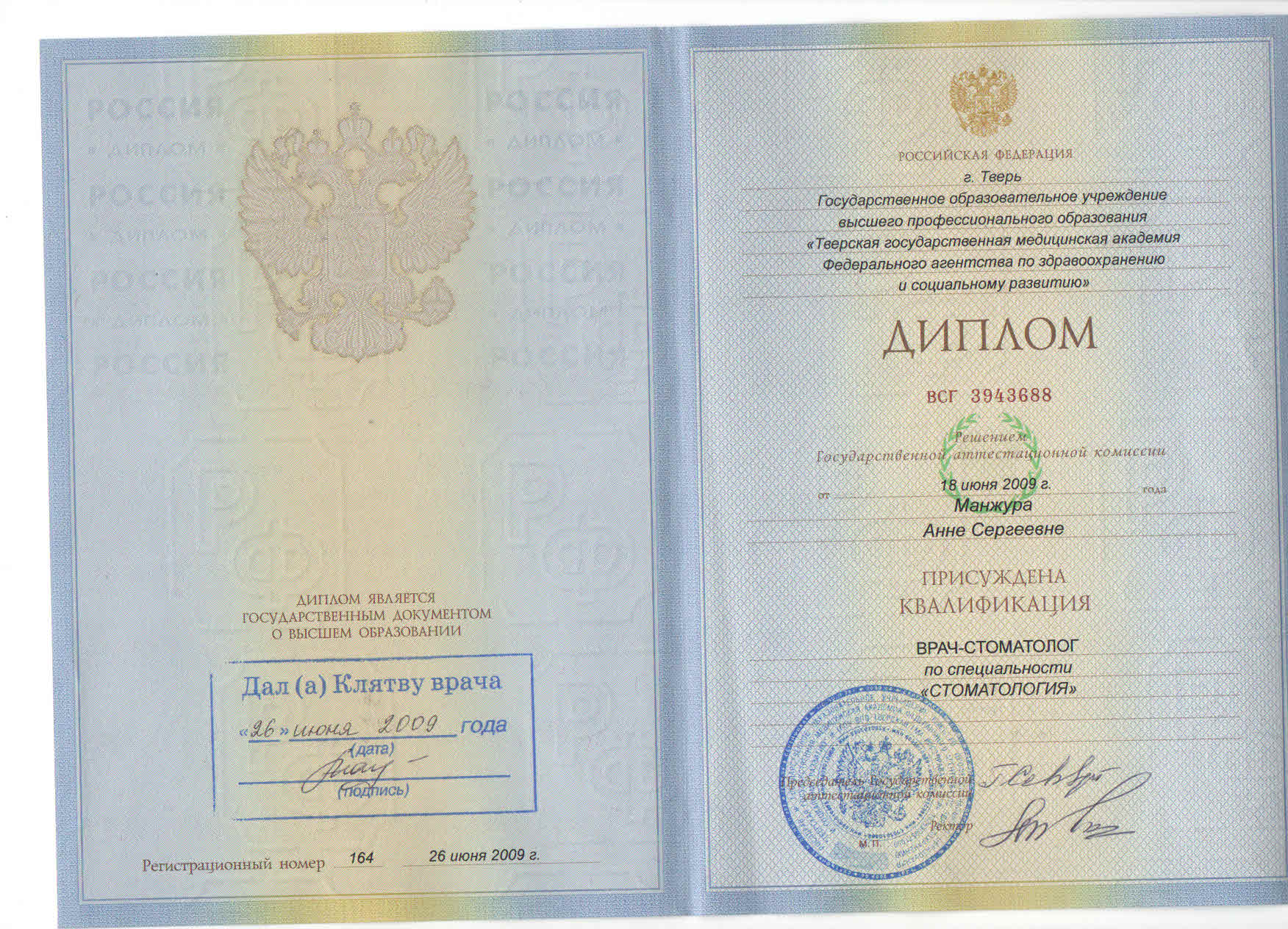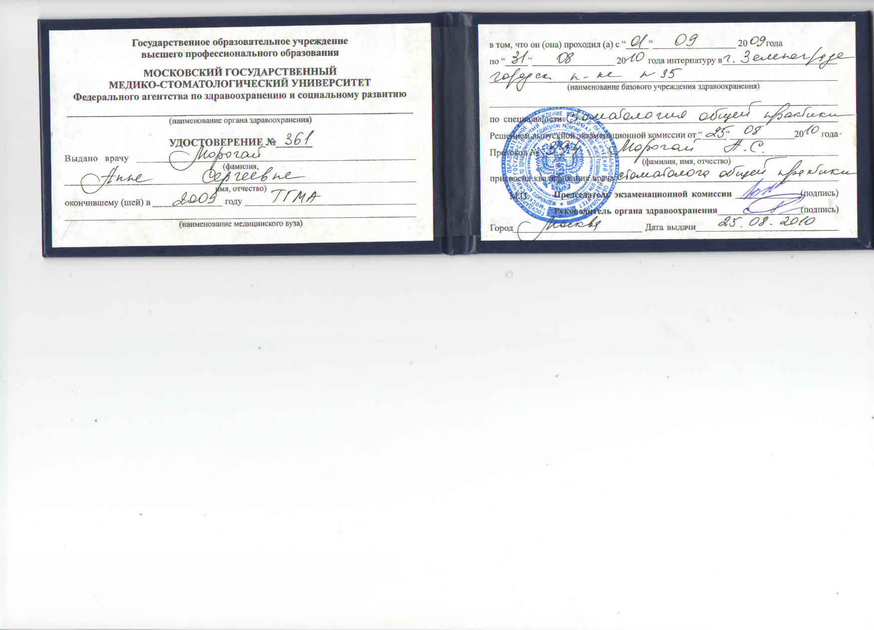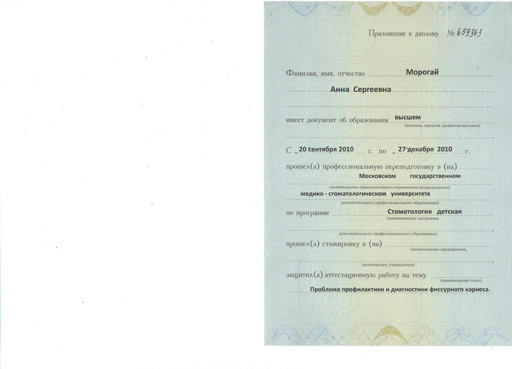 Тверская государственная медицинская академия, 2004-2009, стоматология; Клиническая интернатура на базе «ГБУЗ СП 35» г. Зеленоград; Диплом о профессиональной переподготовки «стоматология детская» 2010, МГМСУ; Постоянный участник конференций и конгрессов по стоматологии.Профессиональные навыки: