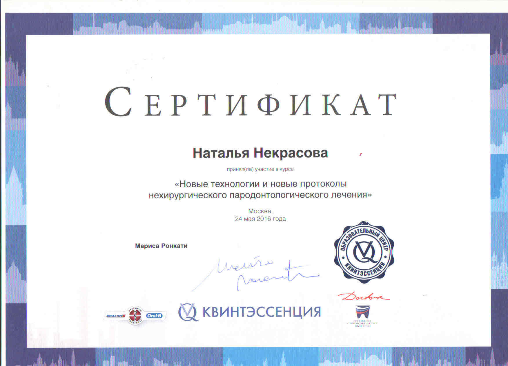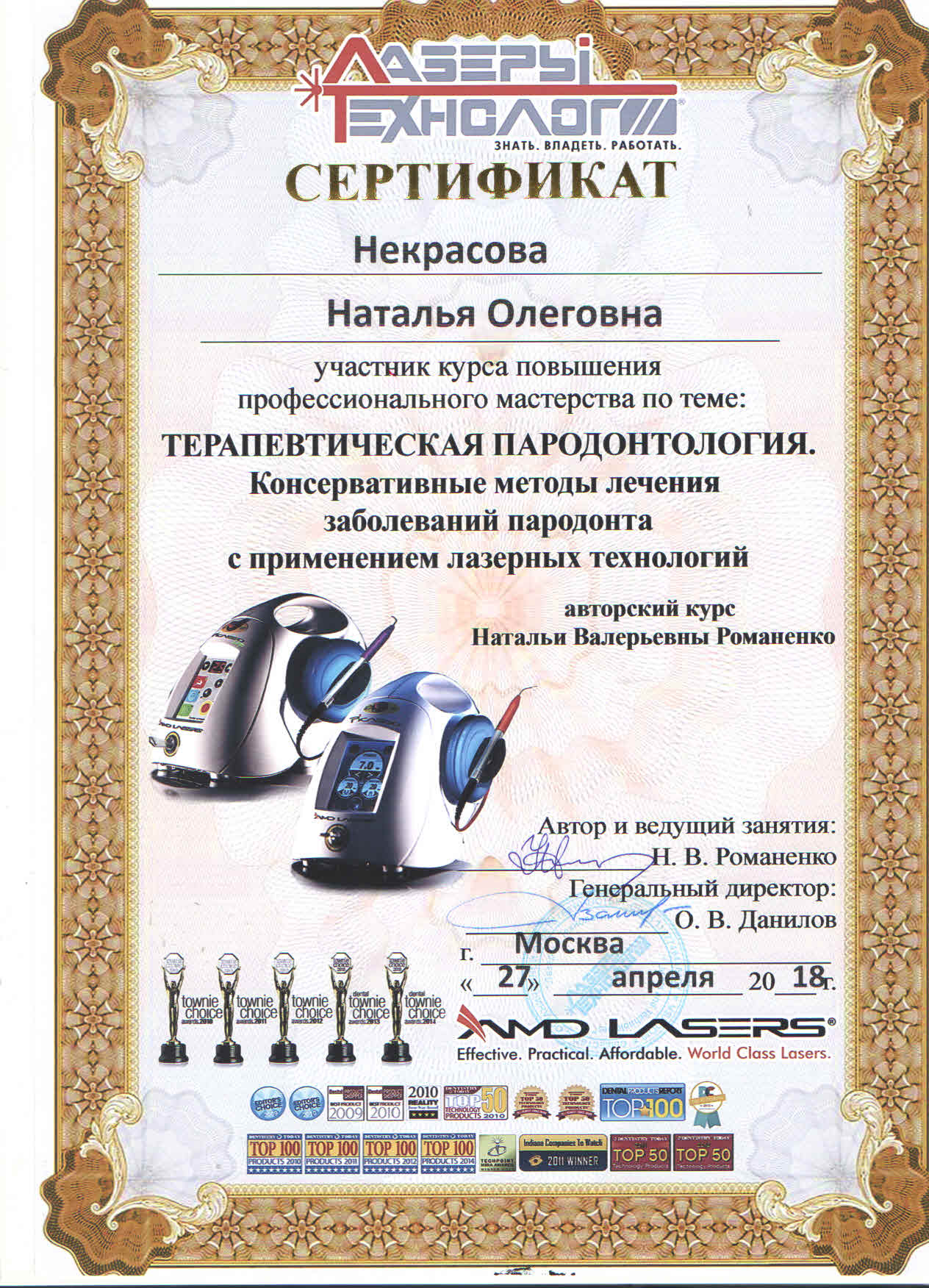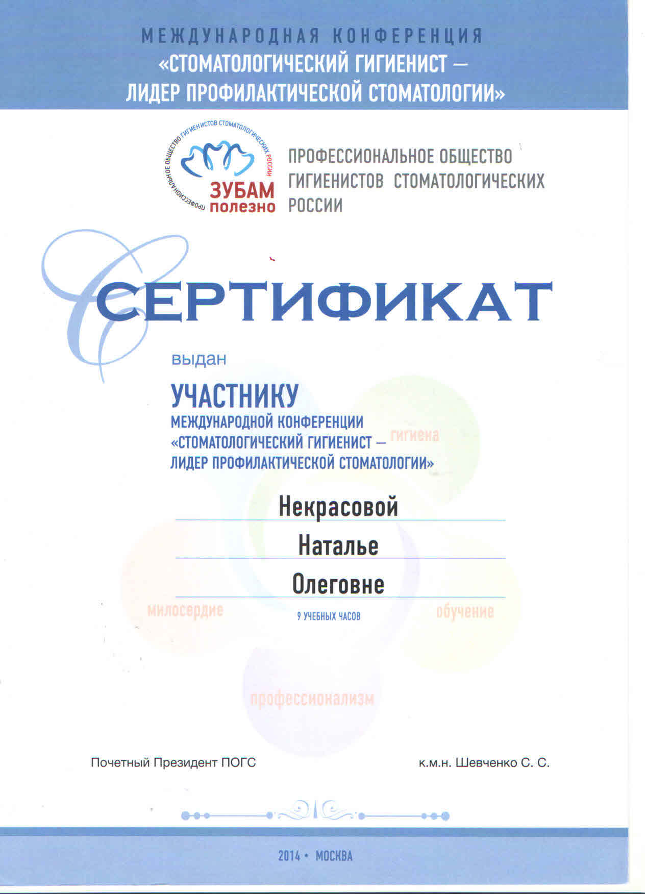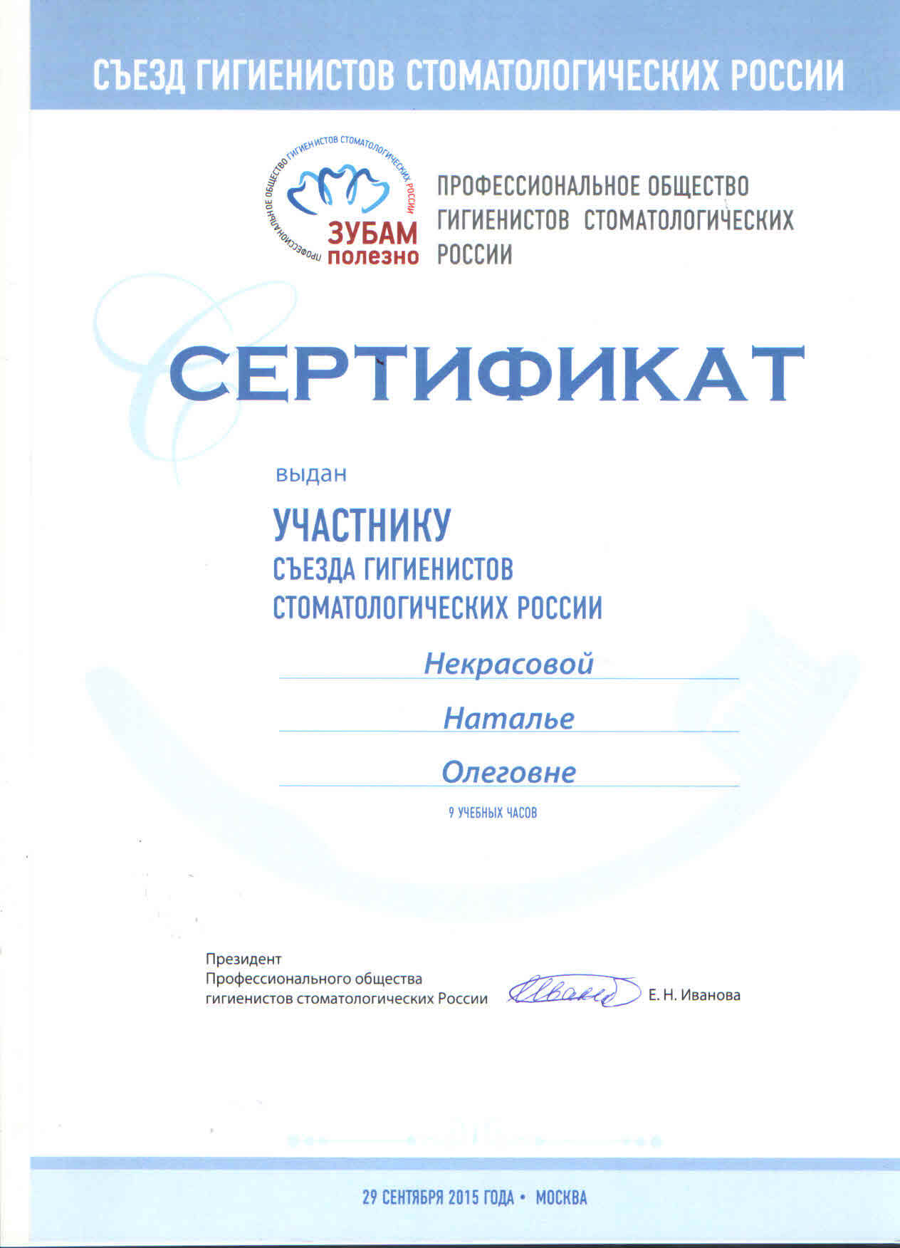 В 2012 году прошла профессиональную переподготовку в НОУ Образовательный центр «Стоматологический колледж №1» по программе «Стоматология профессиональная»; Принято участие в мастер-классе «Использование современных технологий в профессиональной гигиене полости рта. Контроль качества»; Участник регионального конкурса профессионального мастерства «Гигиенист стоматологический», симпозиума современных технологий в стоматологии профилактической «Сохраним улыбку вместе», а также V съезда гигиенистов стоматологических России.Отзывы наших клиентов