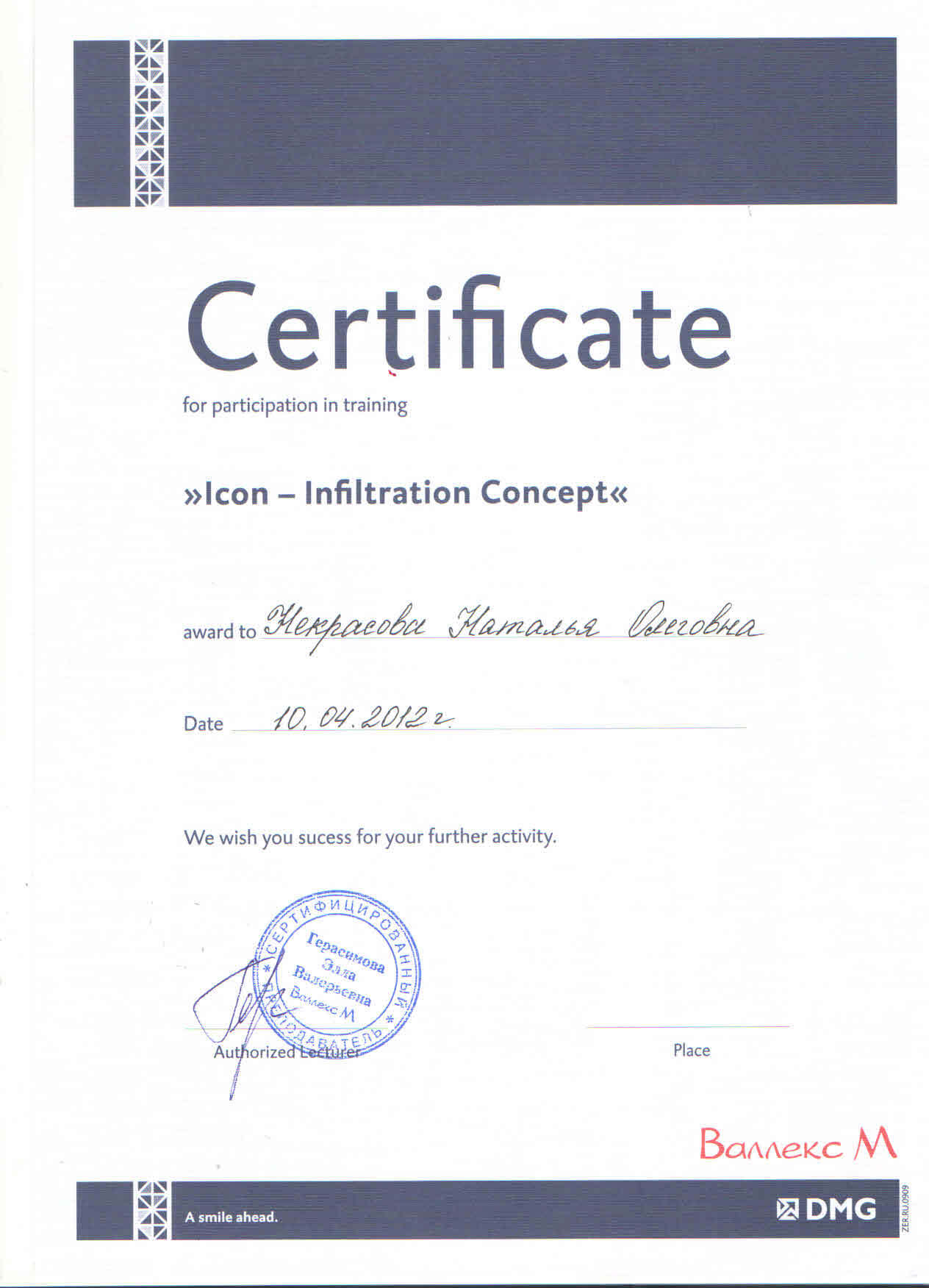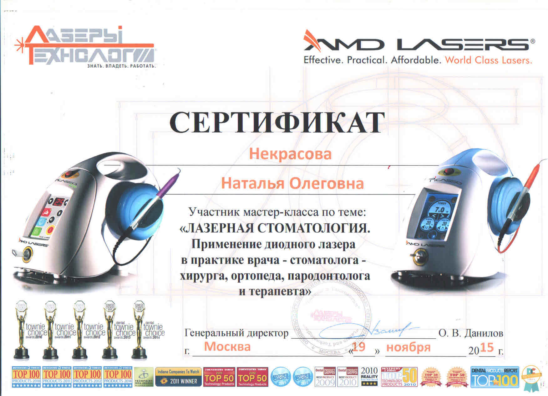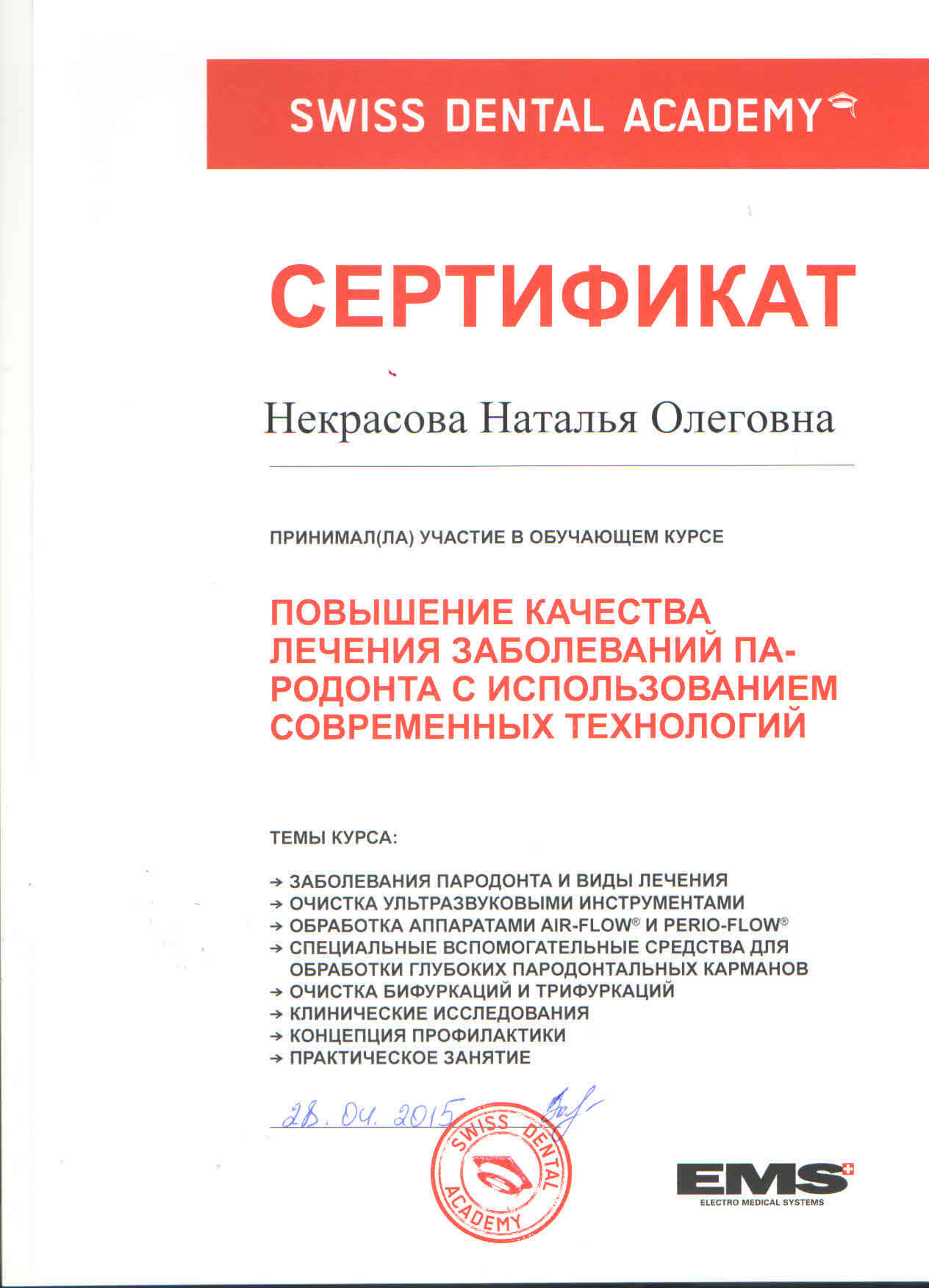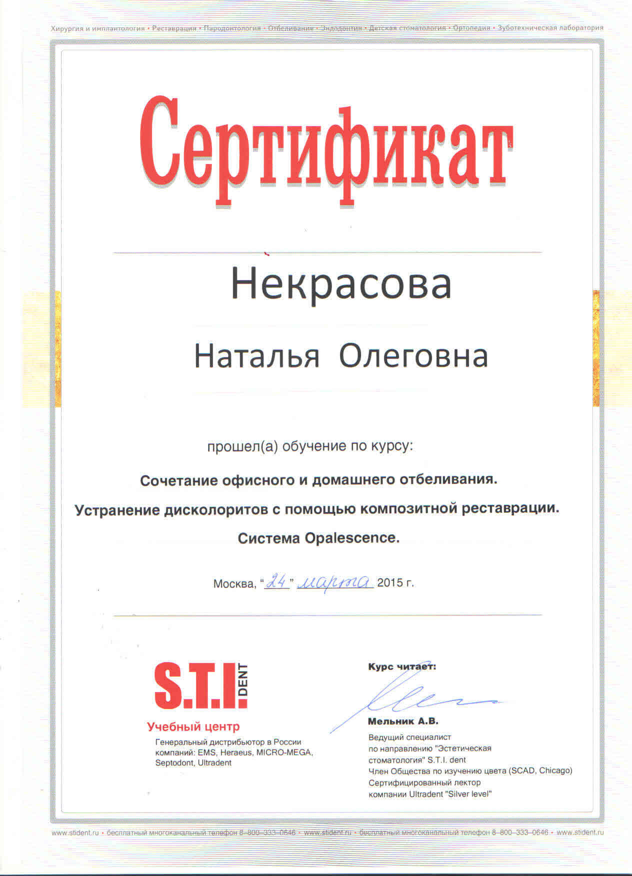 В 2012 году прошла профессиональную переподготовку в НОУ Образовательный центр «Стоматологический колледж №1» по программе «Стоматология профессиональная»; Принято участие в мастер-классе «Использование современных технологий в профессиональной гигиене полости рта. Контроль качества»; Участник регионального конкурса профессионального мастерства «Гигиенист стоматологический», симпозиума современных технологий в стоматологии профилактической «Сохраним улыбку вместе», а также V съезда гигиенистов стоматологических России.Отзывы наших клиентов