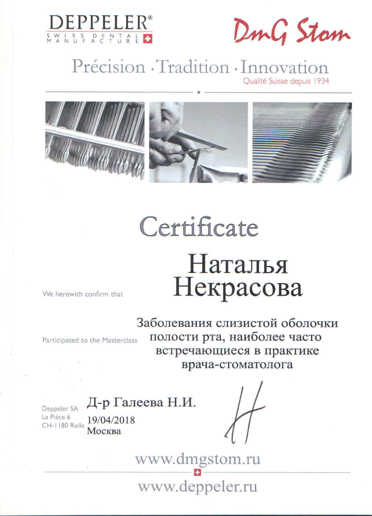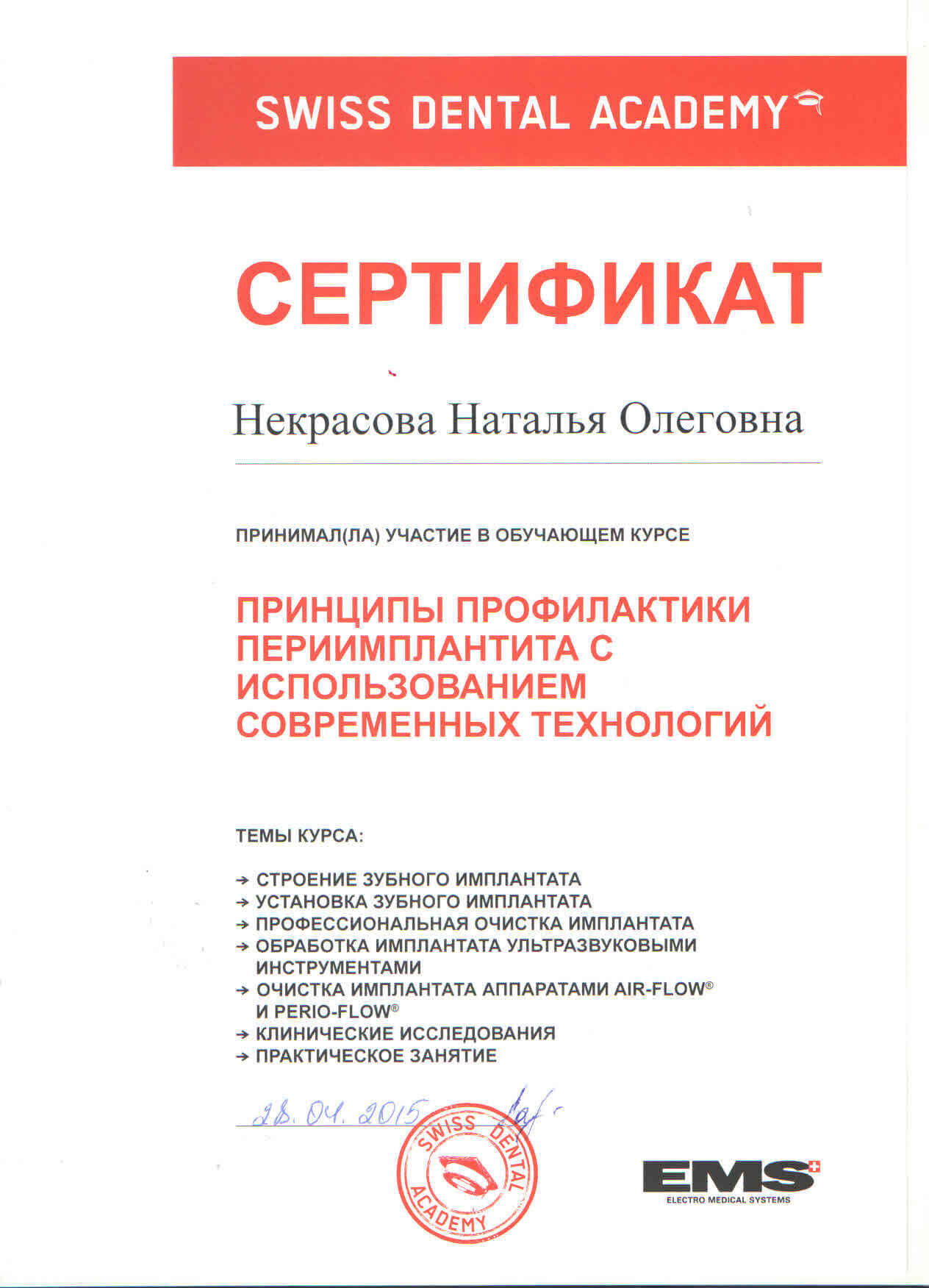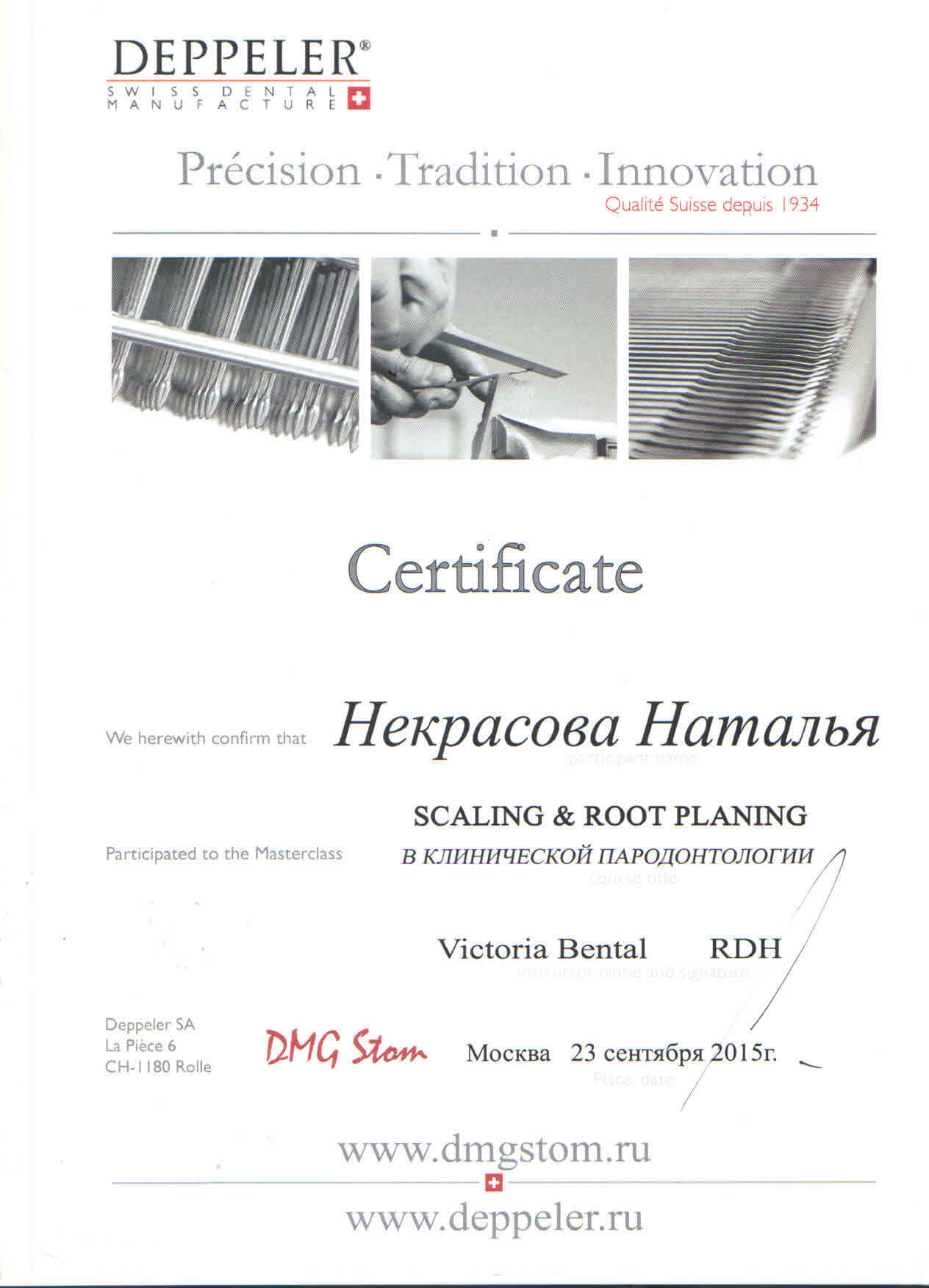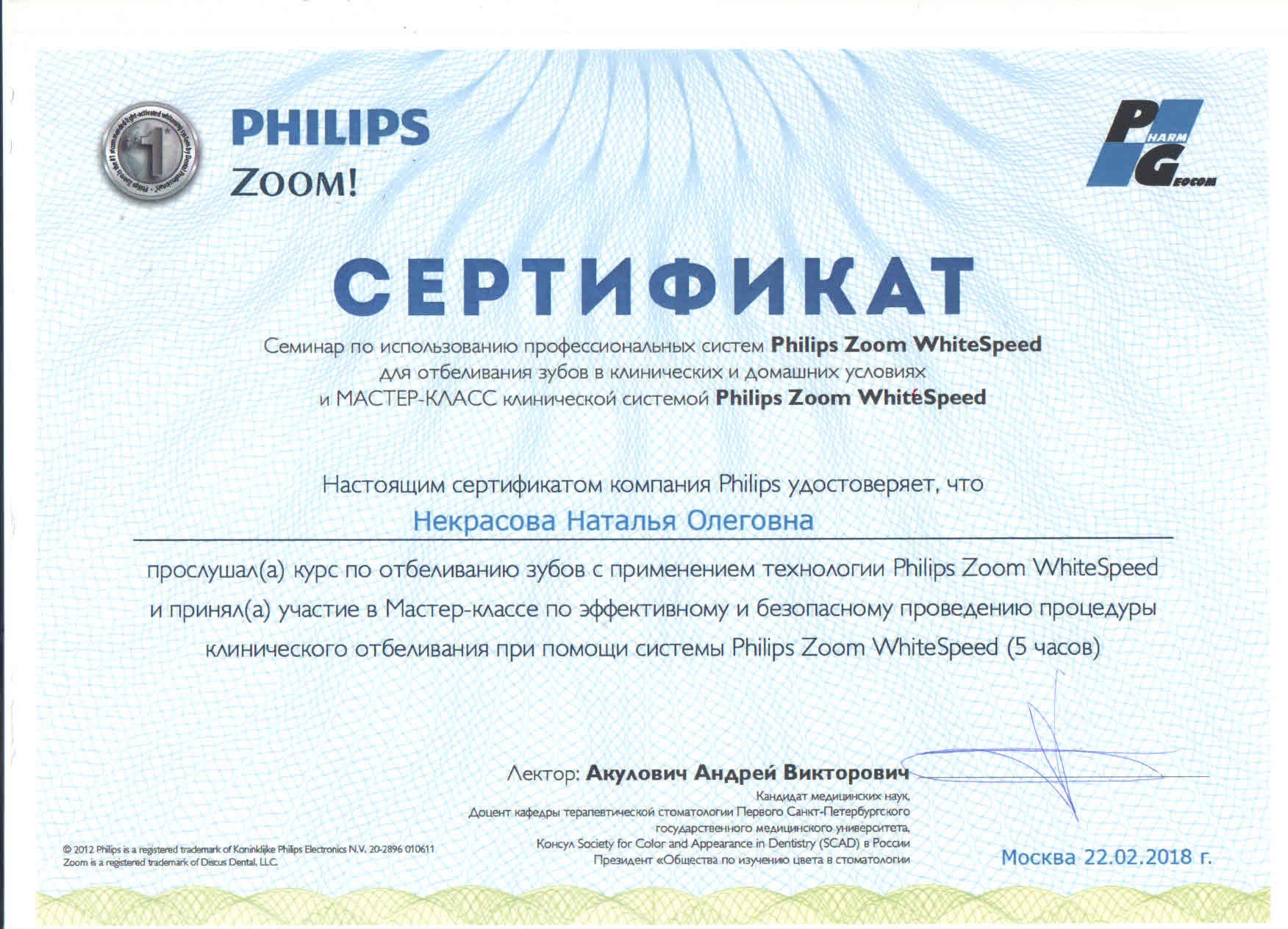 В 2012 году прошла профессиональную переподготовку в НОУ Образовательный центр «Стоматологический колледж №1» по программе «Стоматология профессиональная»; Принято участие в мастер-классе «Использование современных технологий в профессиональной гигиене полости рта. Контроль качества»; Участник регионального конкурса профессионального мастерства «Гигиенист стоматологический», симпозиума современных технологий в стоматологии профилактической «Сохраним улыбку вместе», а также V съезда гигиенистов стоматологических России.Отзывы наших клиентов