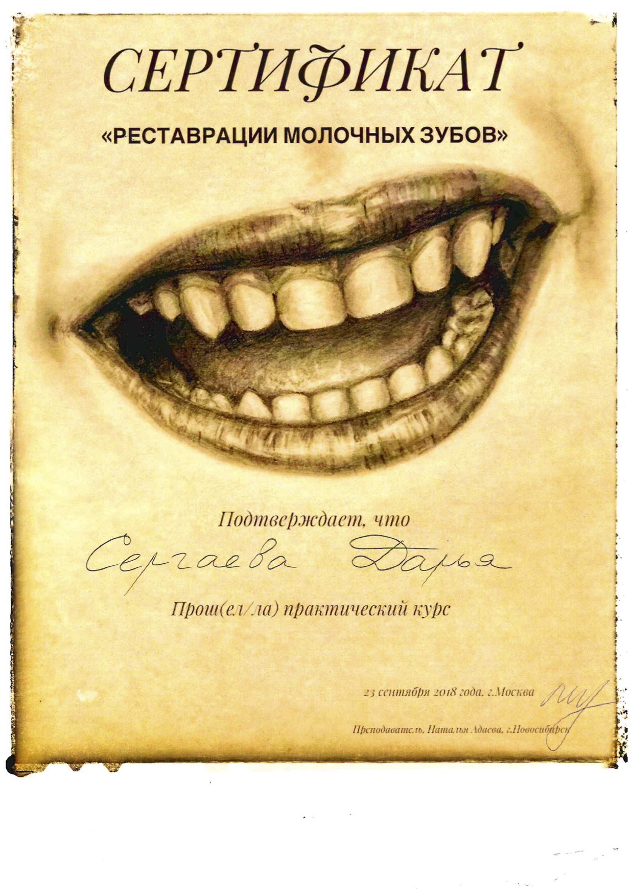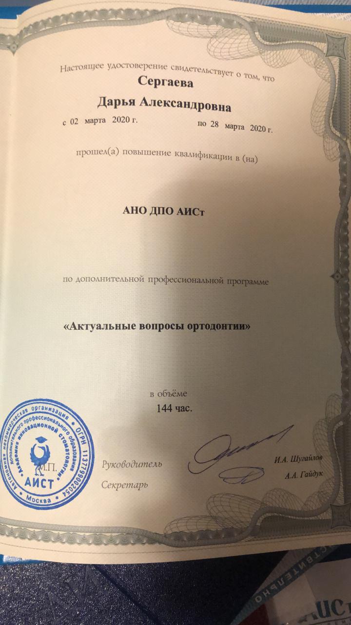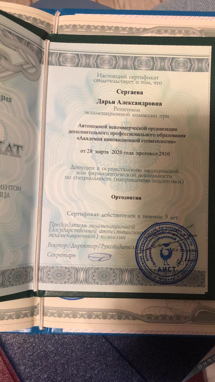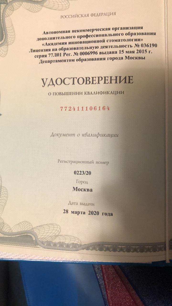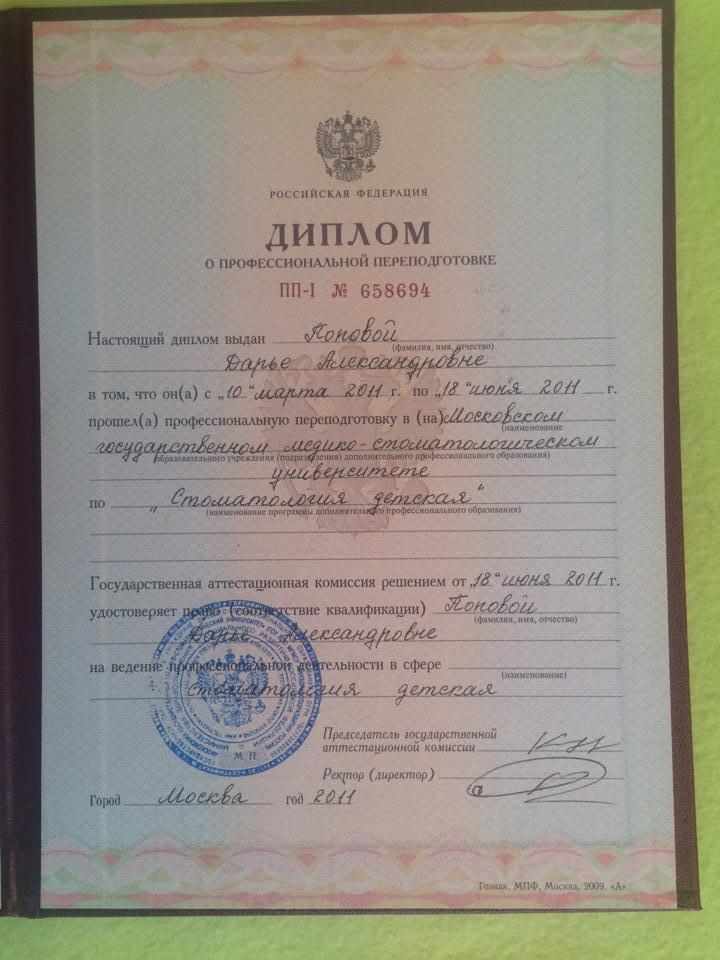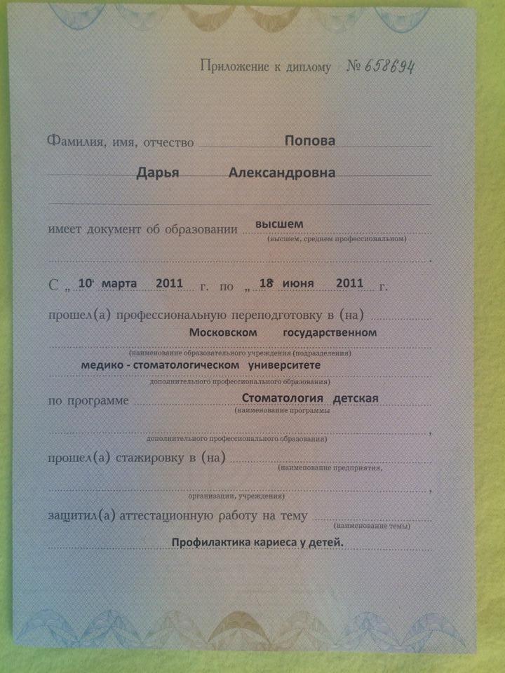 2009 г. — Окончила Тверскую государственную медицинскую академию; Сертификат по специальности «Стоматология общей практики»; 2011 г. — Получила диплом о профессиональной переподготовке по специальности «Стоматология детская» в Московском государственном медико-стоматологическом университете; 2013 г. — Клинические аспекты в каждодневной эндодонтии (Соломонов Михаил); 2014 г. — Окончила ординатуру по специальности «Ортодонтия»; 2016 г. — Подтверждения сертификата врача детской практики; 2017 г. — Подтверждение сертификата врача общей практики; 2017 г. — Микроскоп для стоматологов терапевтов и стоматологов общей практики (Антонина Гецман); 2018 г. — «Этапы лечения системой Damon: от первой дуги до завершения».Оказывает услуги