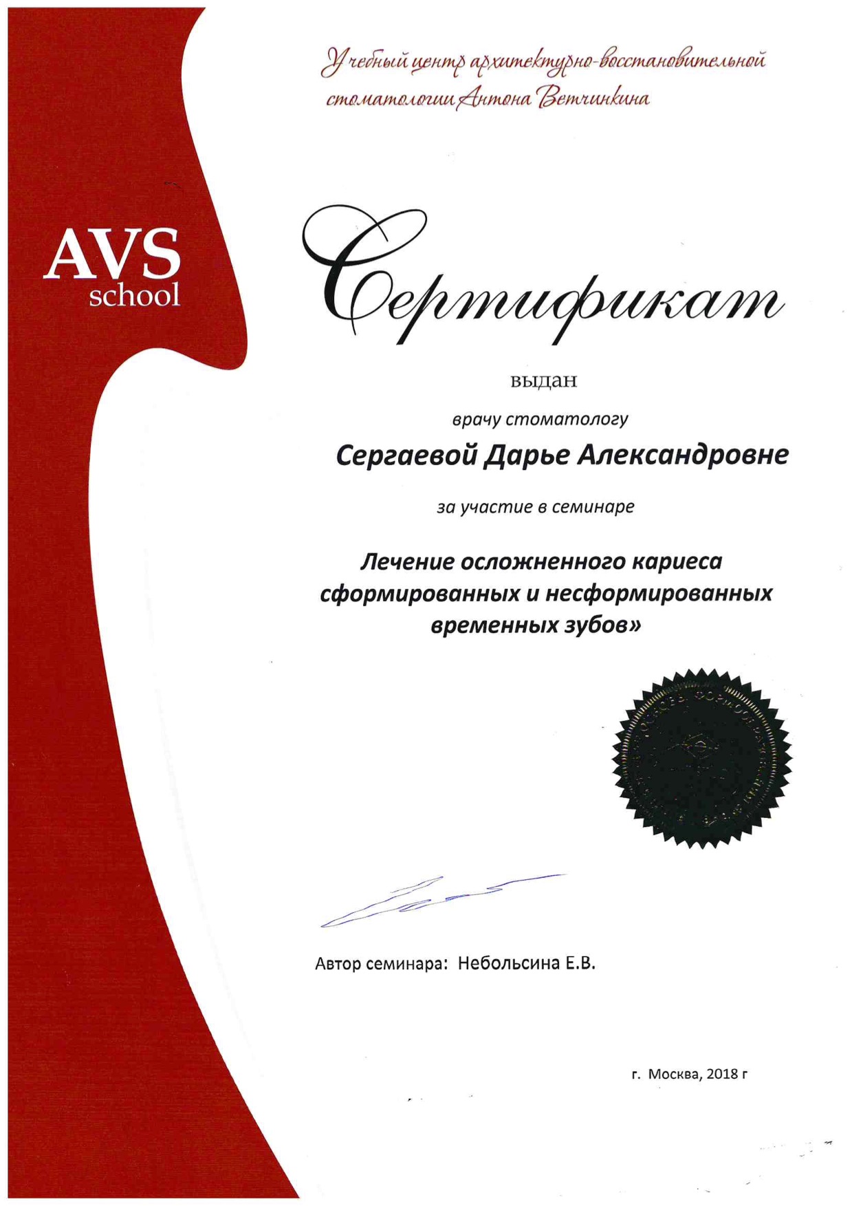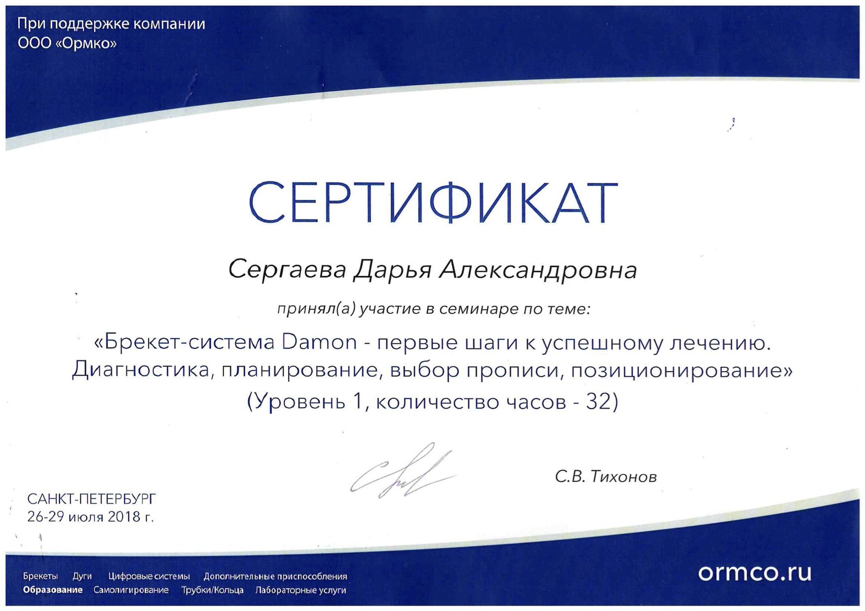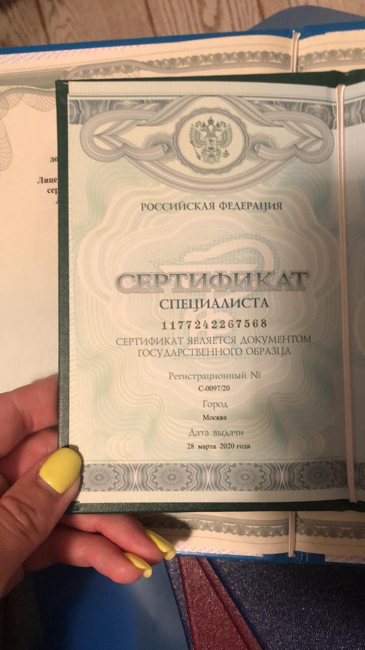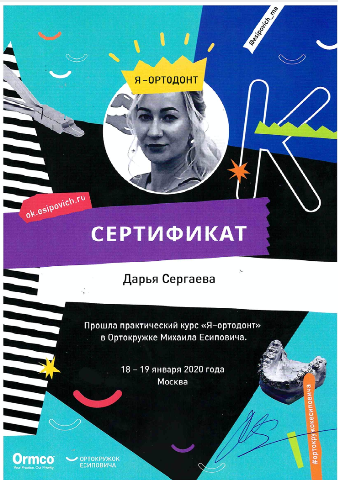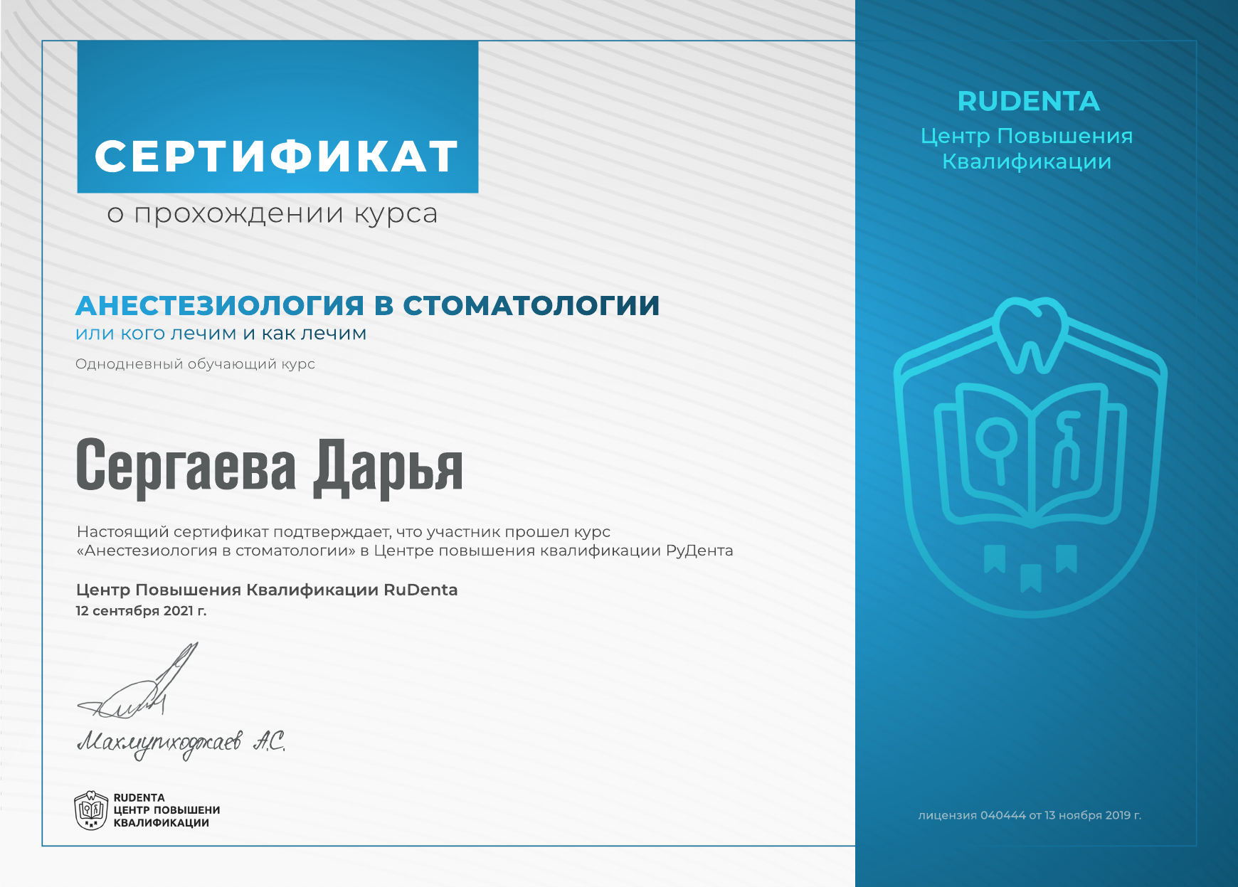 2009 г. — Окончила Тверскую государственную медицинскую академию; Сертификат по специальности «Стоматология общей практики»; 2011 г. — Получила диплом о профессиональной переподготовке по специальности «Стоматология детская» в Московском государственном медико-стоматологическом университете; 2013 г. — Клинические аспекты в каждодневной эндодонтии (Соломонов Михаил); 2014 г. — Окончила ординатуру по специальности «Ортодонтия»; 2016 г. — Подтверждения сертификата врача детской практики; 2017 г. — Подтверждение сертификата врача общей практики; 2017 г. — Микроскоп для стоматологов терапевтов и стоматологов общей практики (Антонина Гецман); 2018 г. — «Этапы лечения системой Damon: от первой дуги до завершения».Оказывает услуги