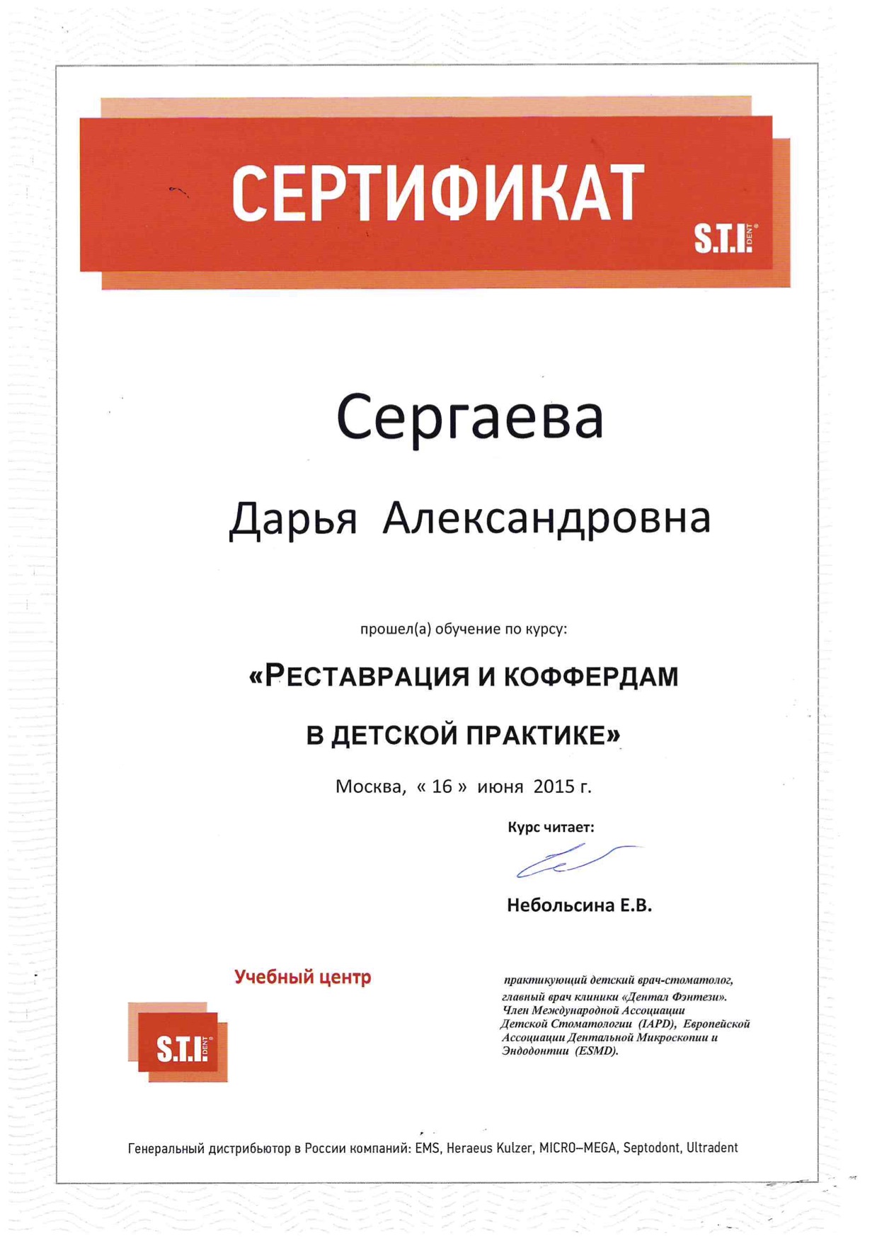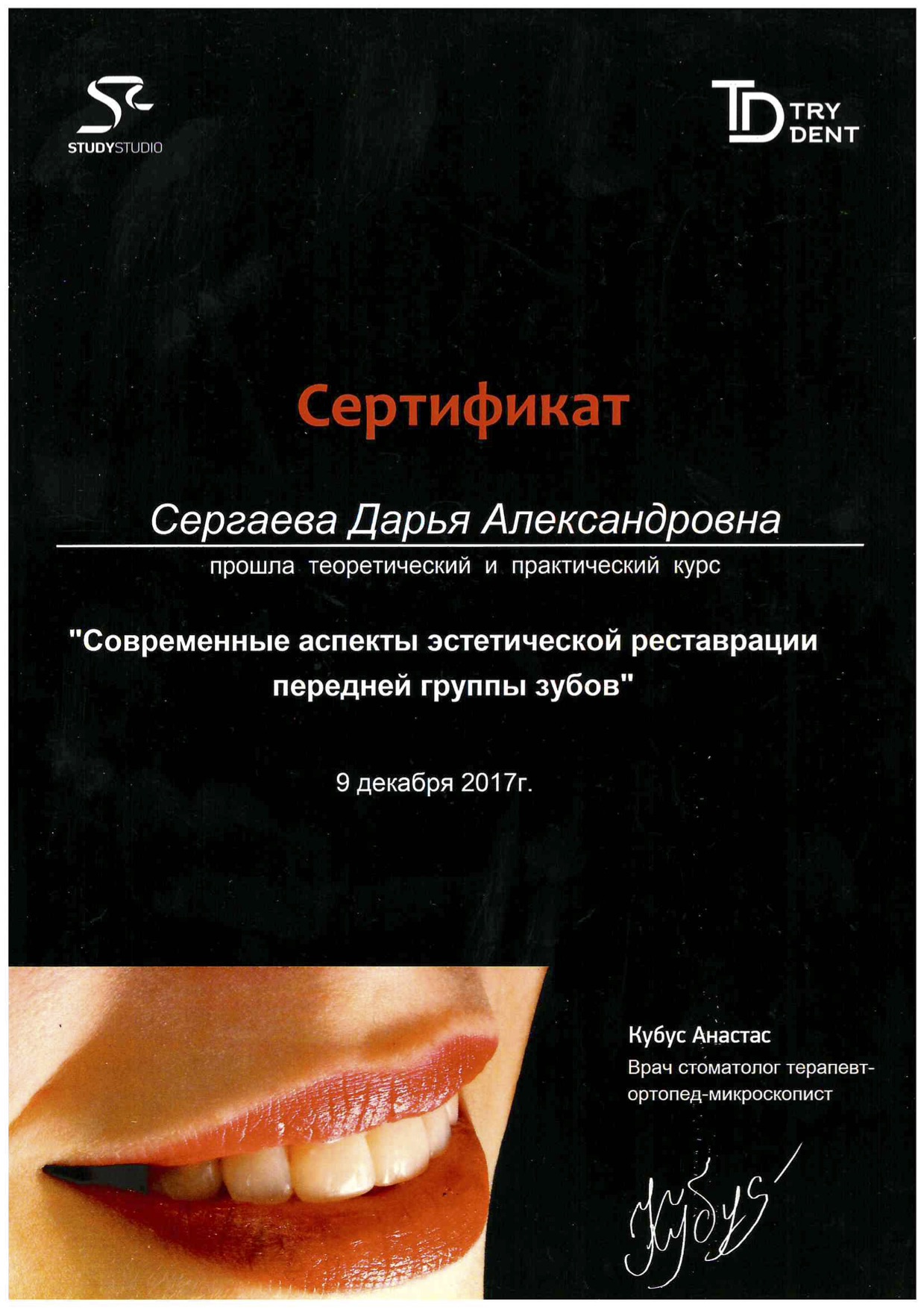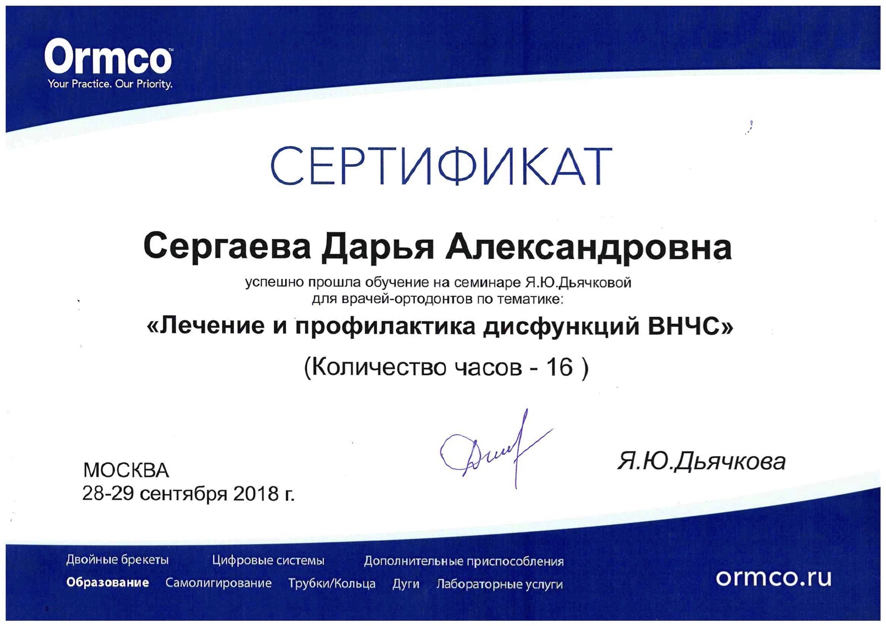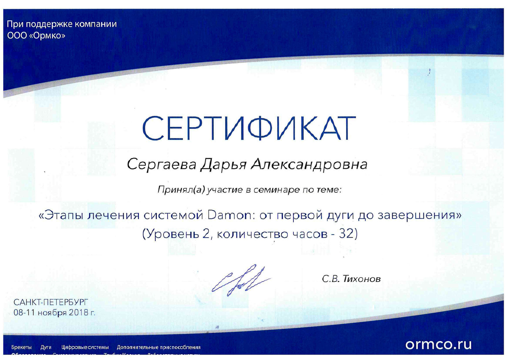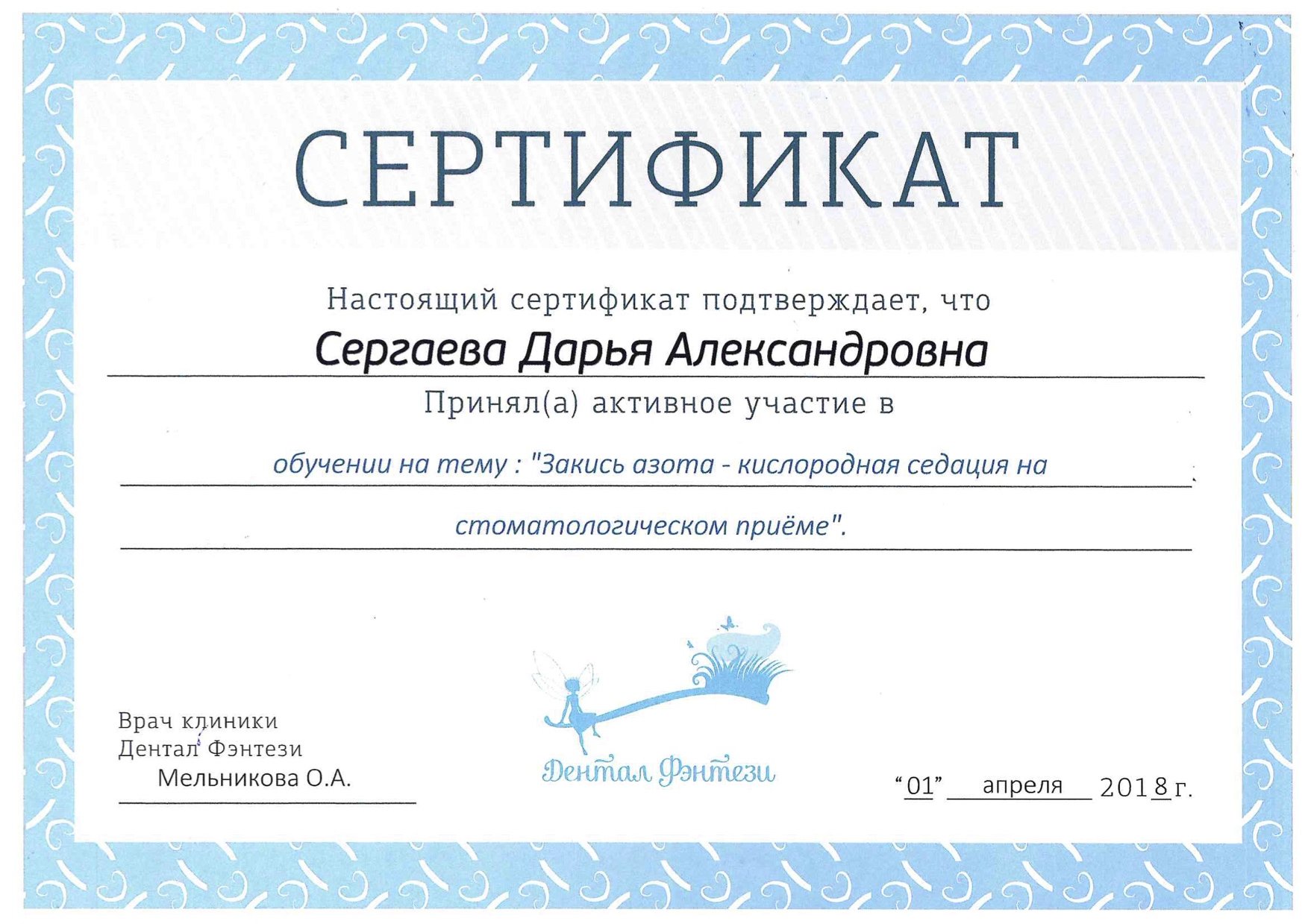 2009 г. — Окончила Тверскую государственную медицинскую академию; Сертификат по специальности «Стоматология общей практики»; 2011 г. — Получила диплом о профессиональной переподготовке по специальности «Стоматология детская» в Московском государственном медико-стоматологическом университете; 2013 г. — Клинические аспекты в каждодневной эндодонтии (Соломонов Михаил); 2014 г. — Окончила ординатуру по специальности «Ортодонтия»; 2016 г. — Подтверждения сертификата врача детской практики; 2017 г. — Подтверждение сертификата врача общей практики; 2017 г. — Микроскоп для стоматологов терапевтов и стоматологов общей практики (Антонина Гецман); 2018 г. — «Этапы лечения системой Damon: от первой дуги до завершения».Оказывает услуги