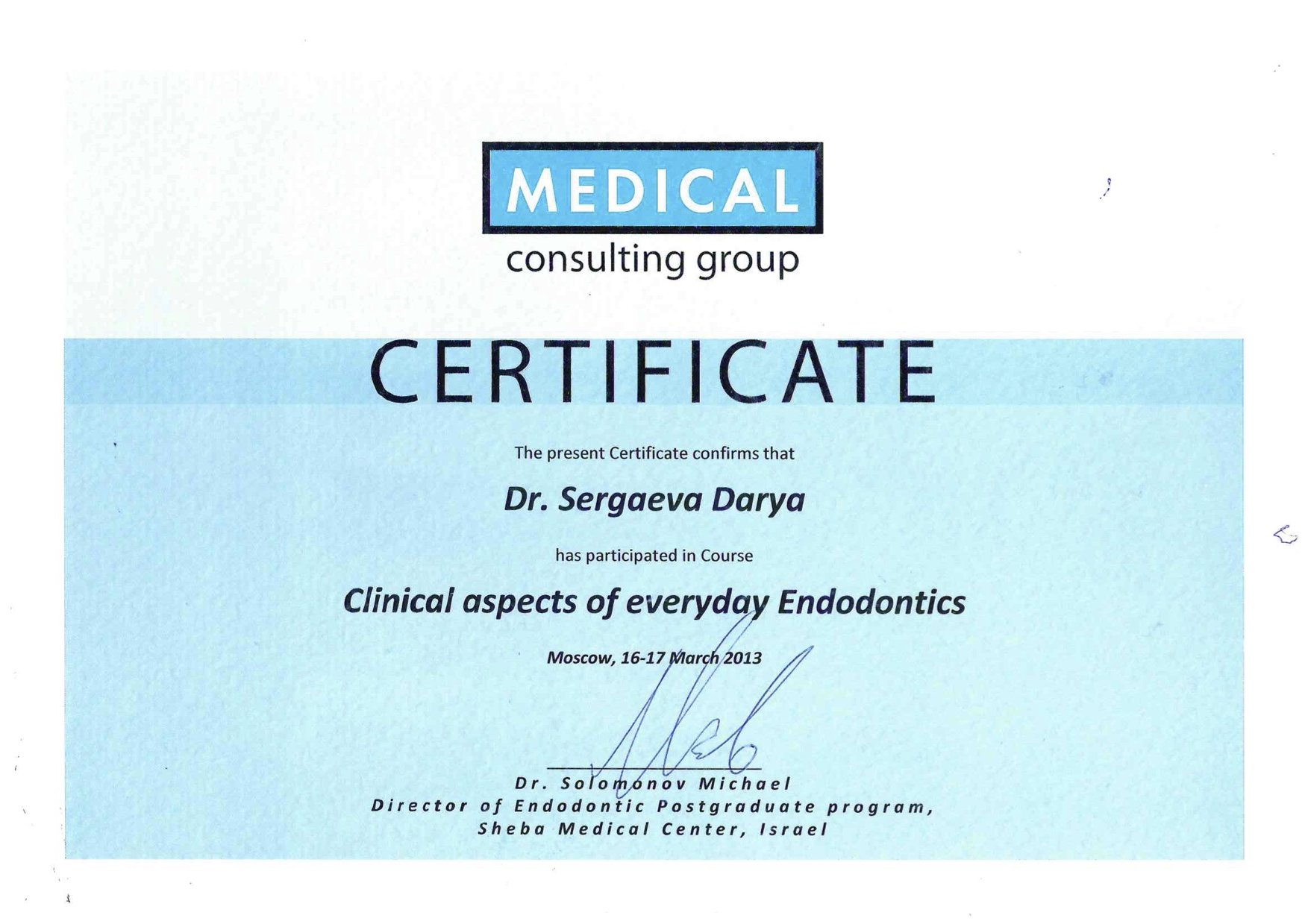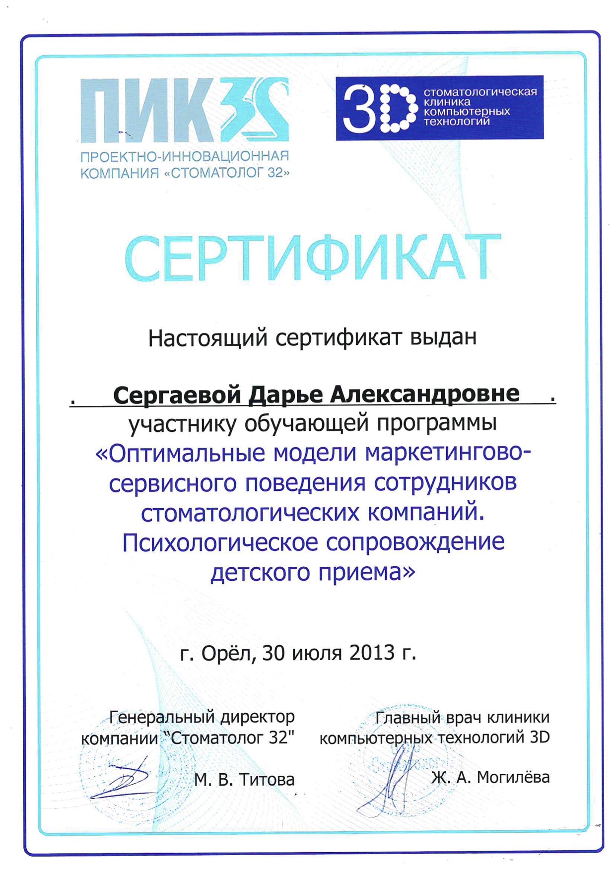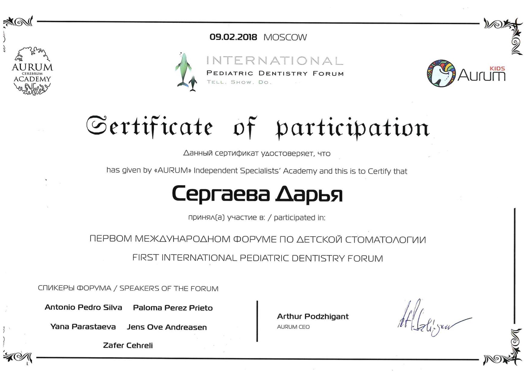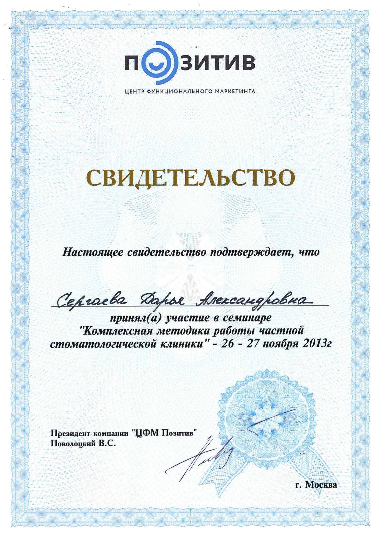 2009 г. — Окончила Тверскую государственную медицинскую академию; Сертификат по специальности «Стоматология общей практики»; 2011 г. — Получила диплом о профессиональной переподготовке по специальности «Стоматология детская» в Московском государственном медико-стоматологическом университете; 2013 г. — Клинические аспекты в каждодневной эндодонтии (Соломонов Михаил); 2014 г. — Окончила ординатуру по специальности «Ортодонтия»; 2016 г. — Подтверждения сертификата врача детской практики; 2017 г. — Подтверждение сертификата врача общей практики; 2017 г. — Микроскоп для стоматологов терапевтов и стоматологов общей практики (Антонина Гецман); 2018 г. — «Этапы лечения системой Damon: от первой дуги до завершения».Оказывает услуги