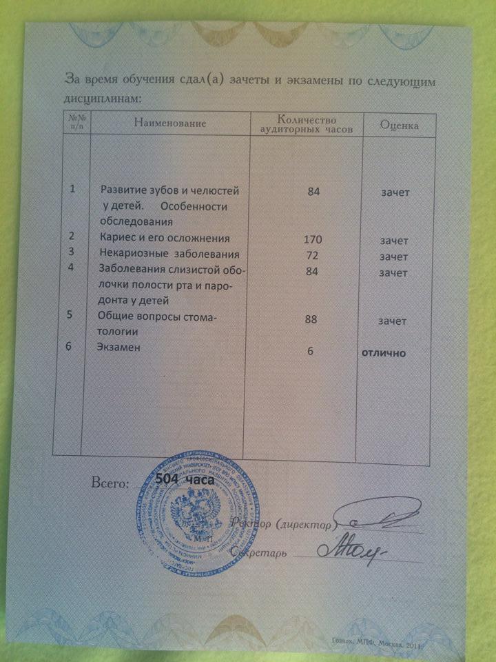 1. Стоматология детская (уникальный номер реестровой записи об аккредитации 7722 02939520) до 26.10.2027г.2. Ортодонтия (уникальный номер реестровой записи об аккредитации 7725 032629314) до 25.02.2030г.