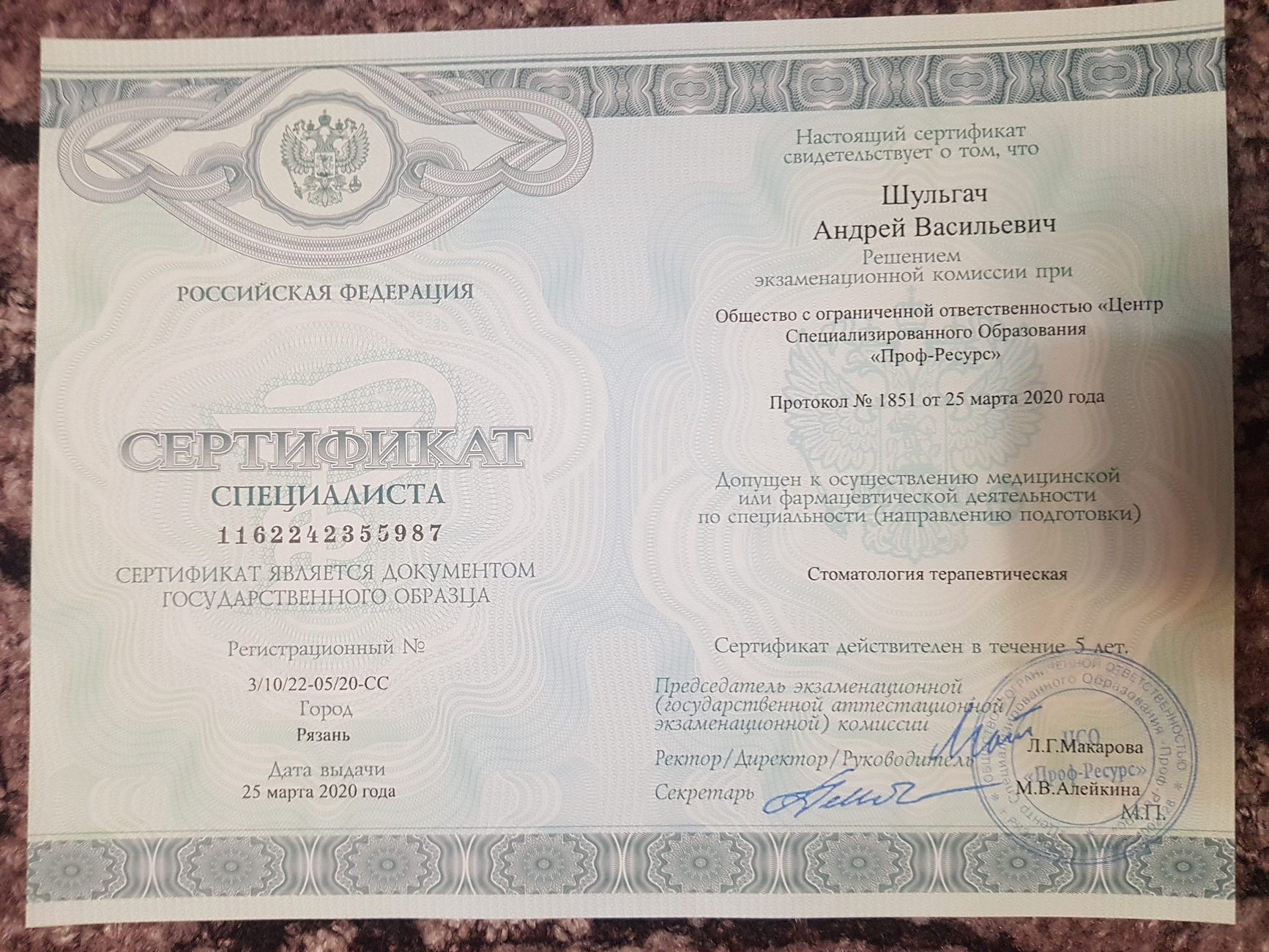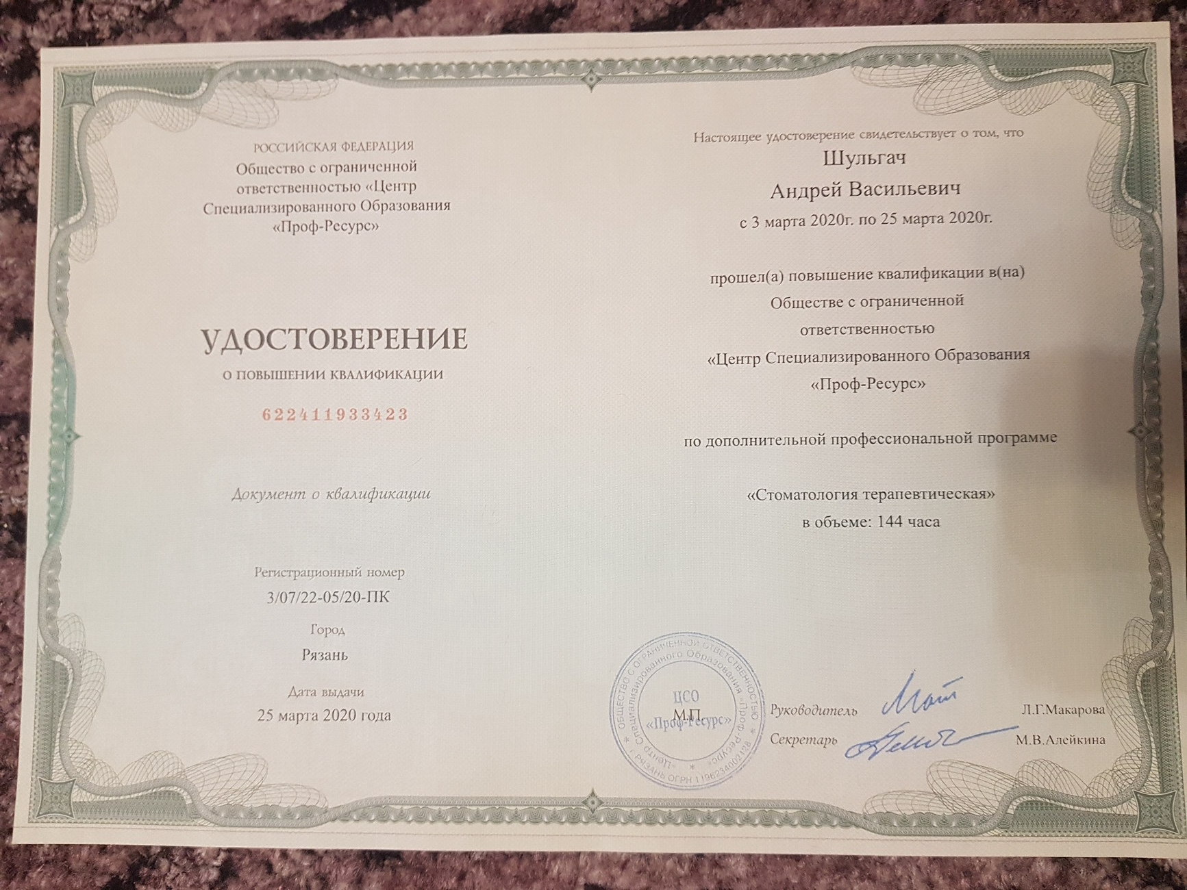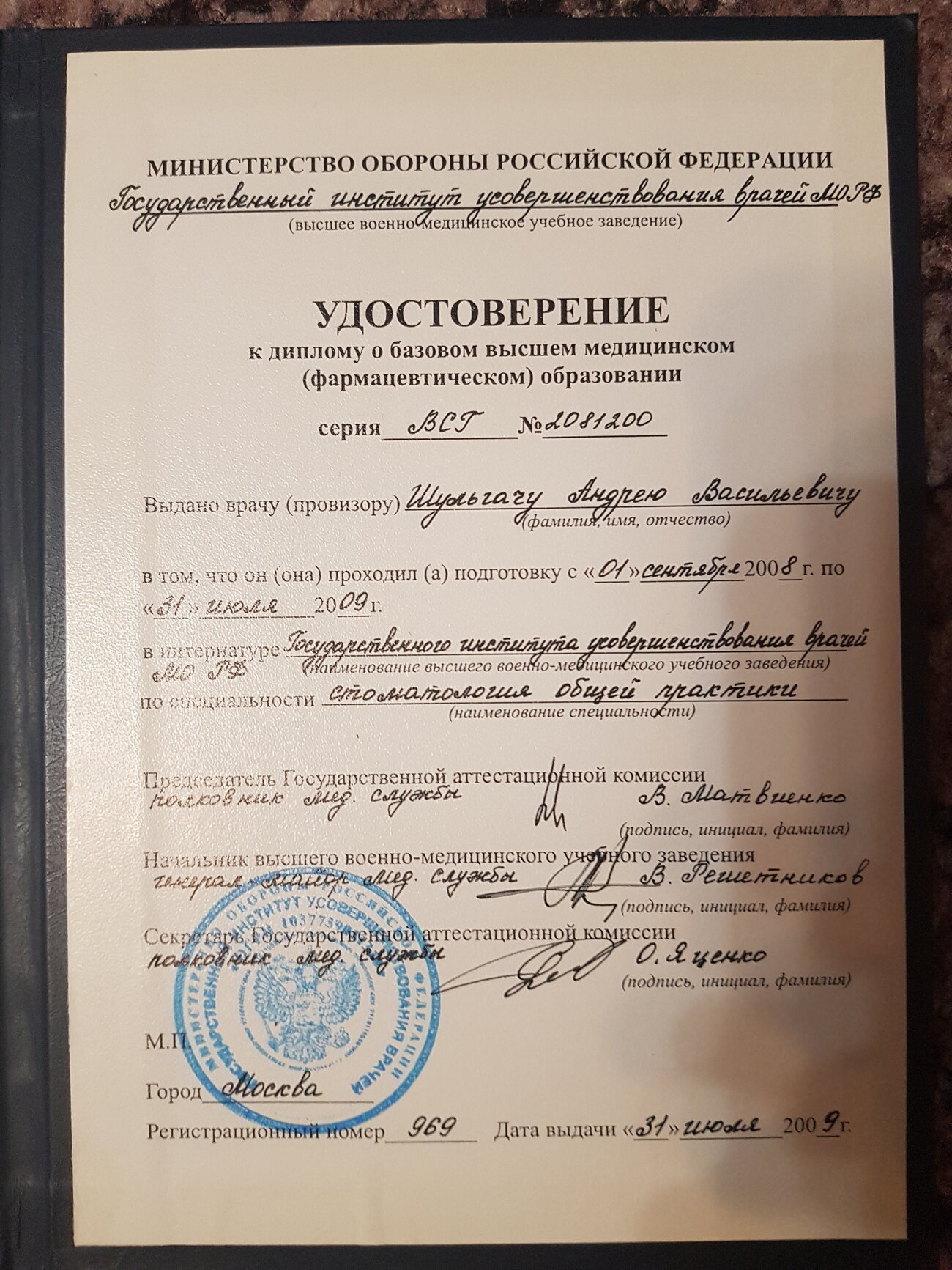 2009 г. — Интернатура. Государственный институт усовершенствования врачей МО РФ по специальности: стоматология общей практики;
