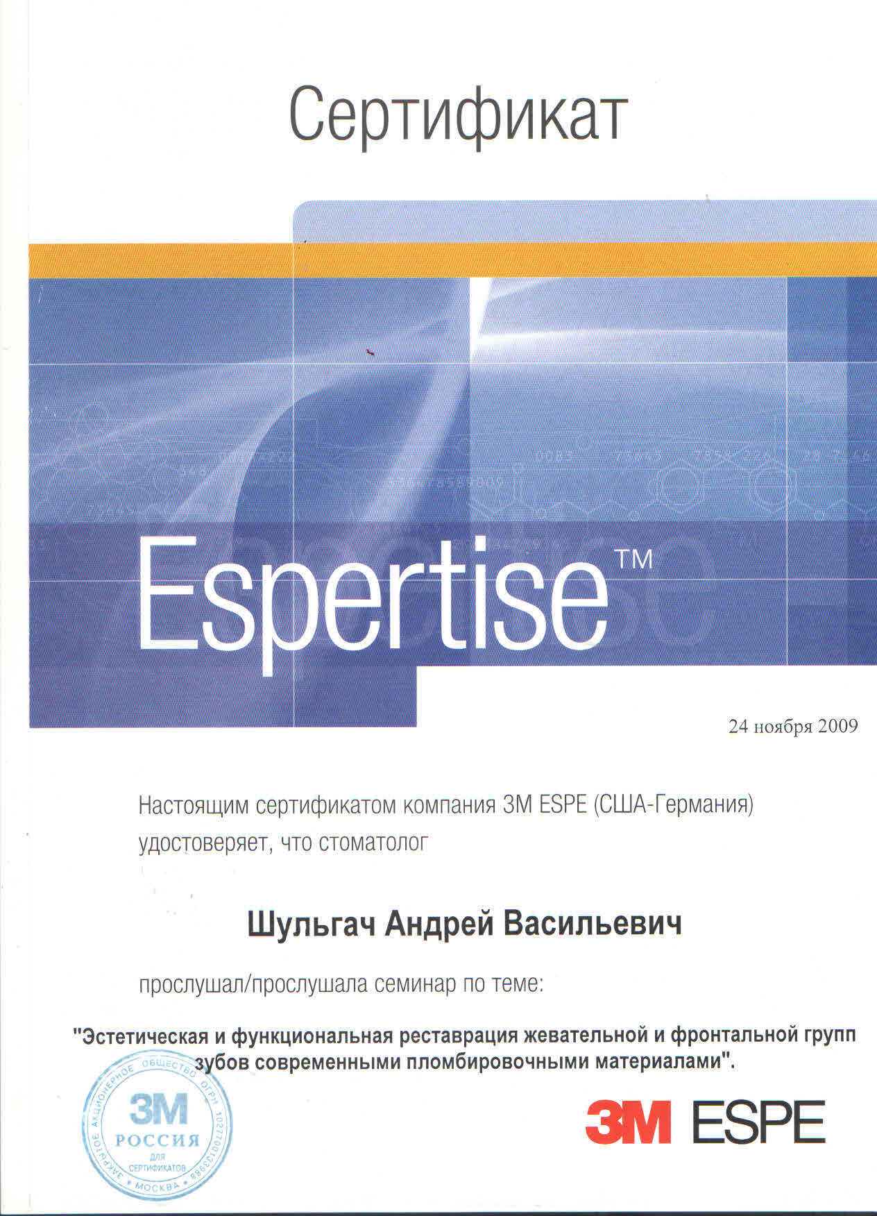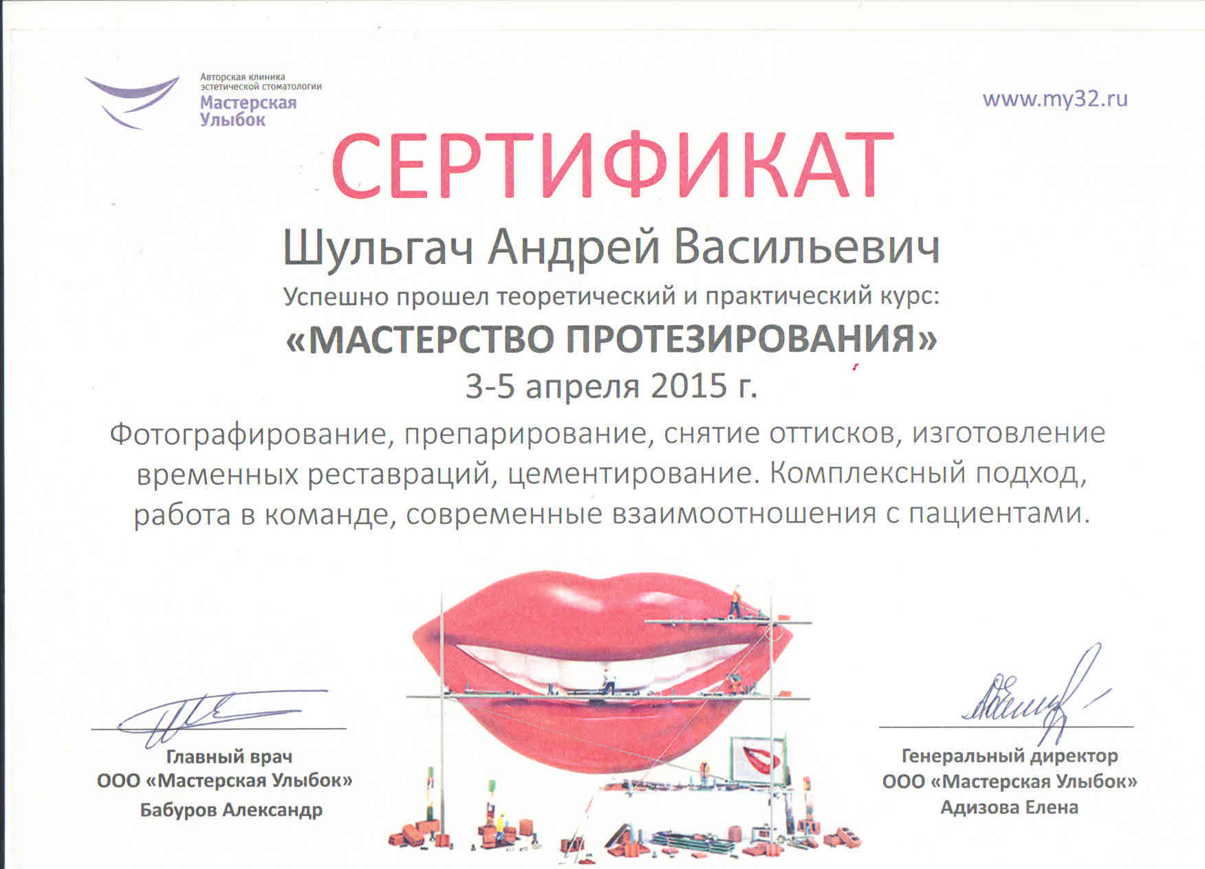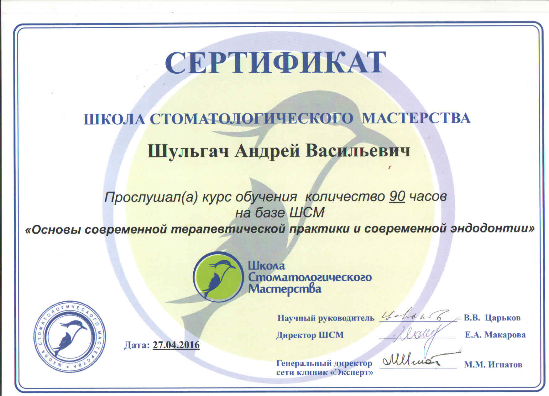 2009 г. — Интернатура. Государственный институт усовершенствования врачей МО РФ по специальности: стоматология общей практики;
