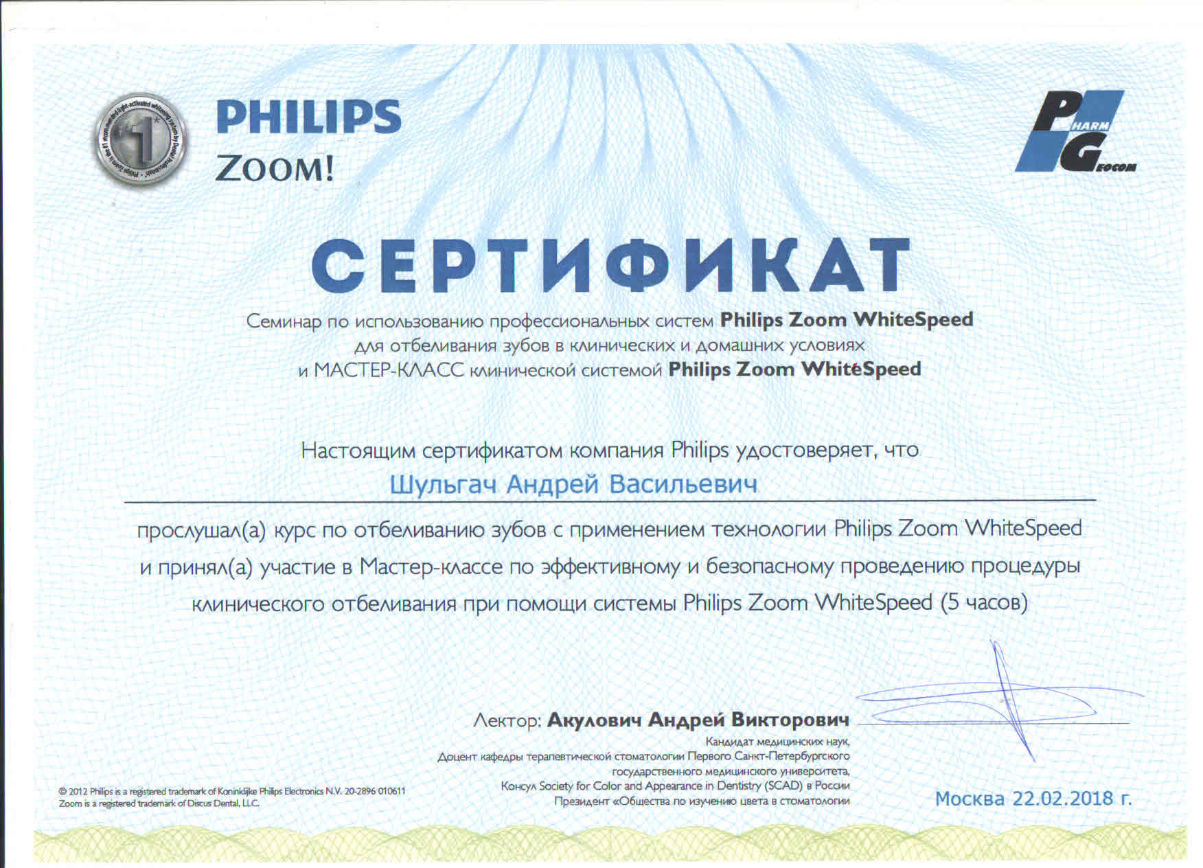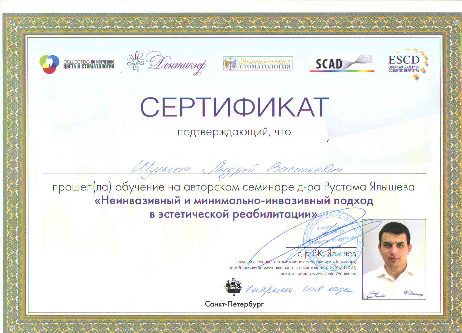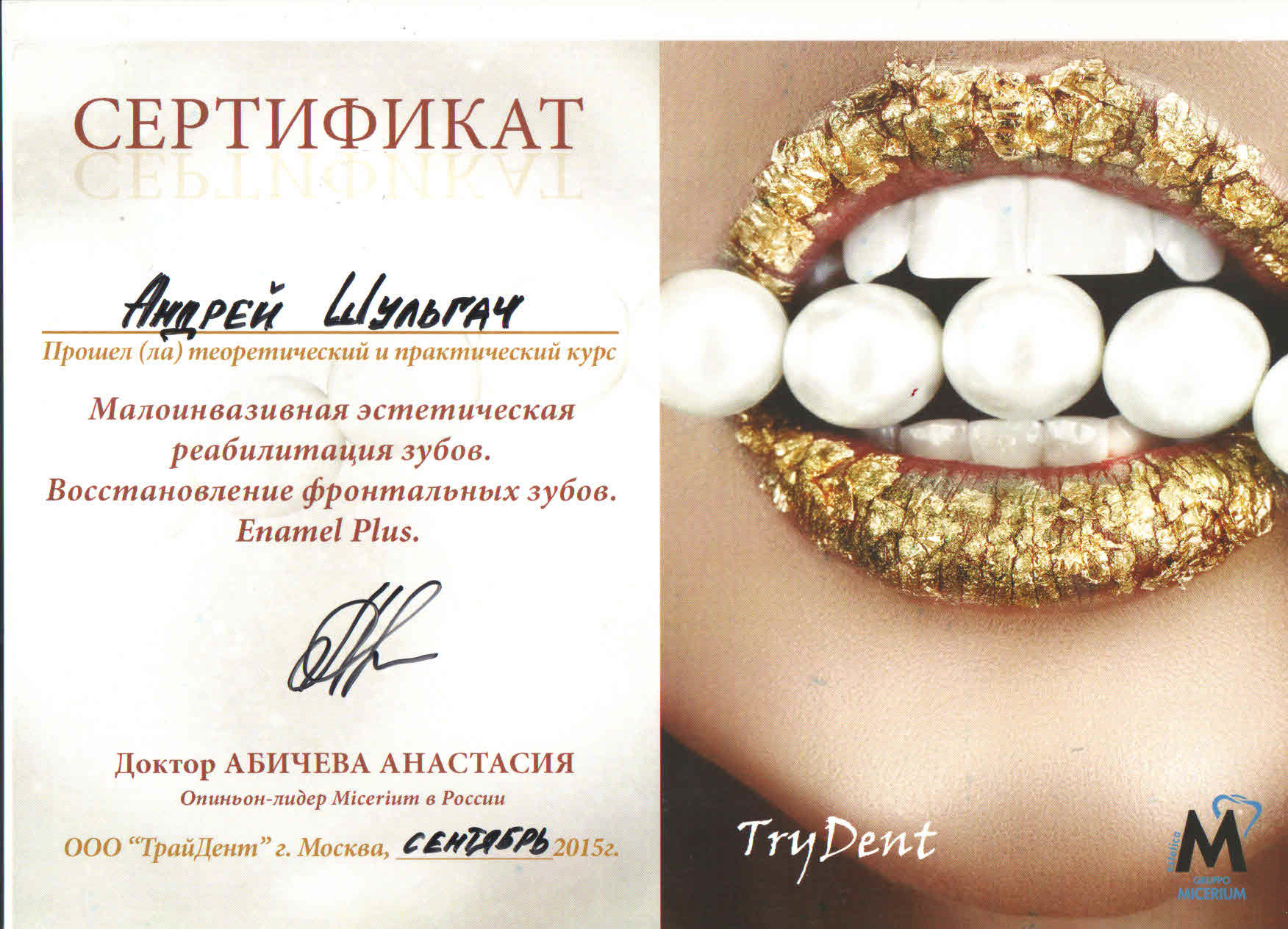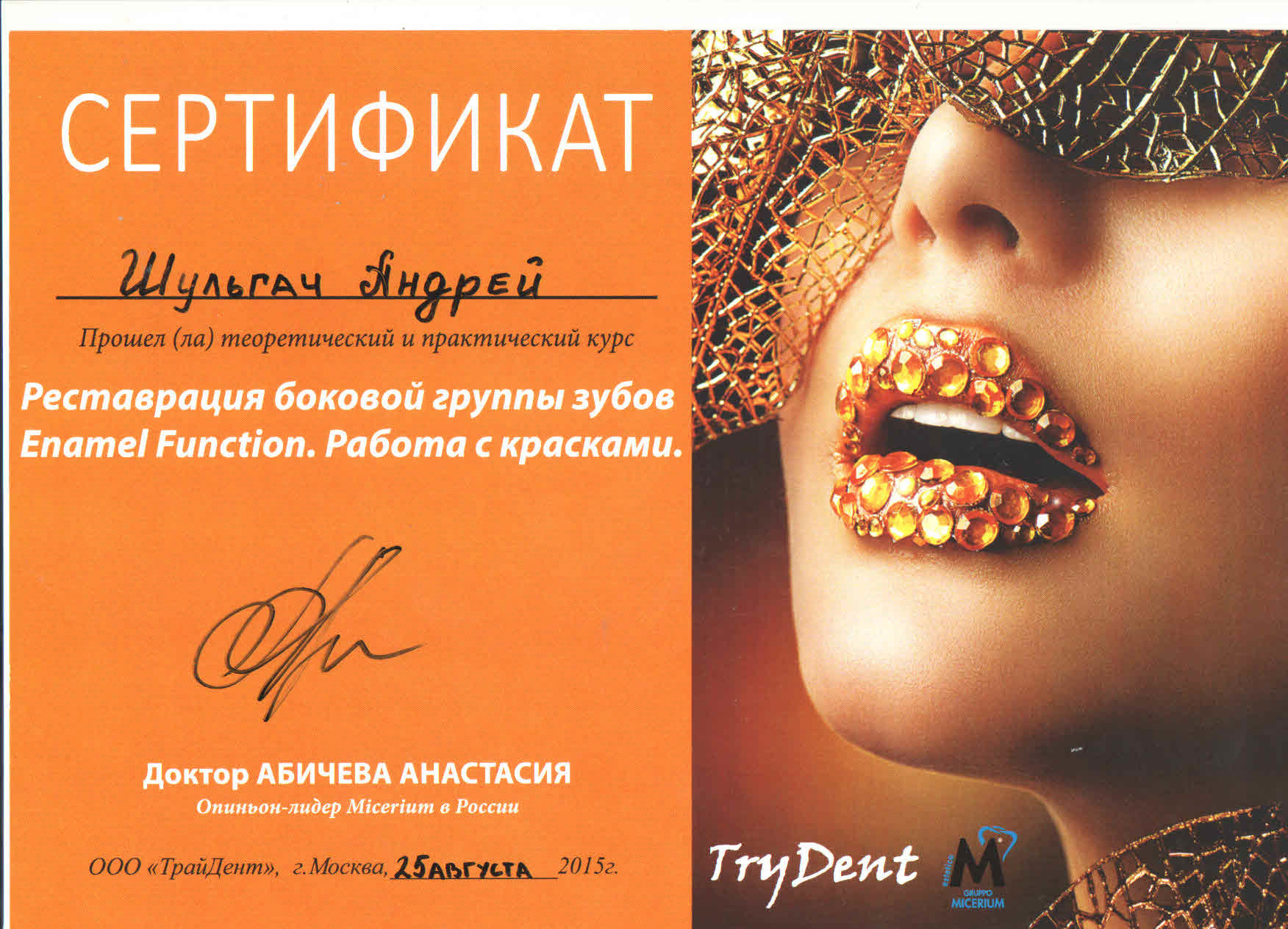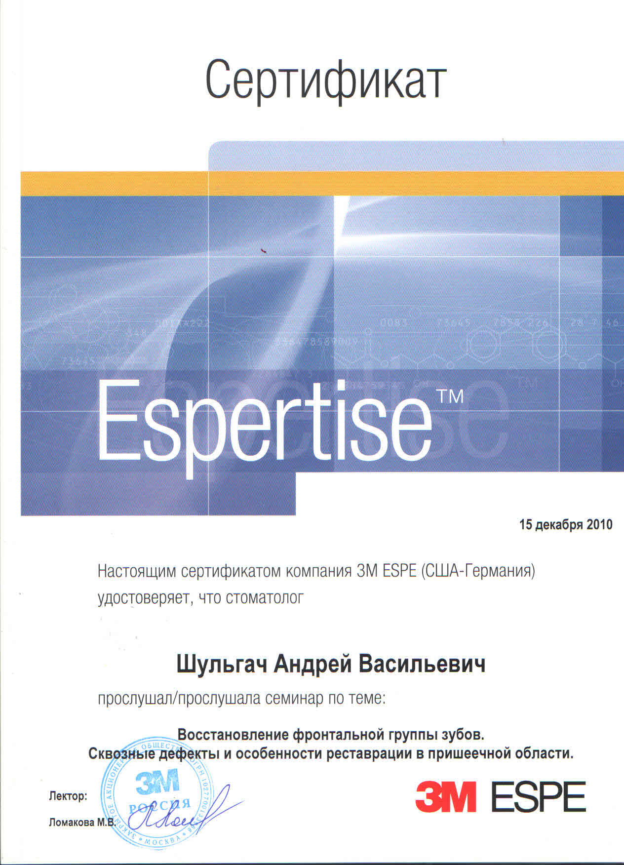 2012 г. — Профессиональная переподготовка в ФГБОУ ДПО Институте повышения квалификации ФМБА России по специальности: Стоматология Терапевтическая;
