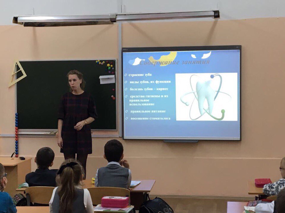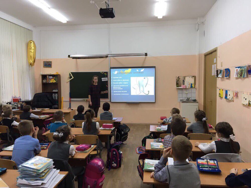 И еще одна школа, в которой мы реализуем программу — это школа 719 в 9 микрорайоне Зеленограда. Там уже прошел первый урок, на котором наши врачи и педагог-психолог Ирина рассказали детям о строении зубов, об уходе за полостью рта и средствах гигиены, а также о причинах возникновения кариеса.