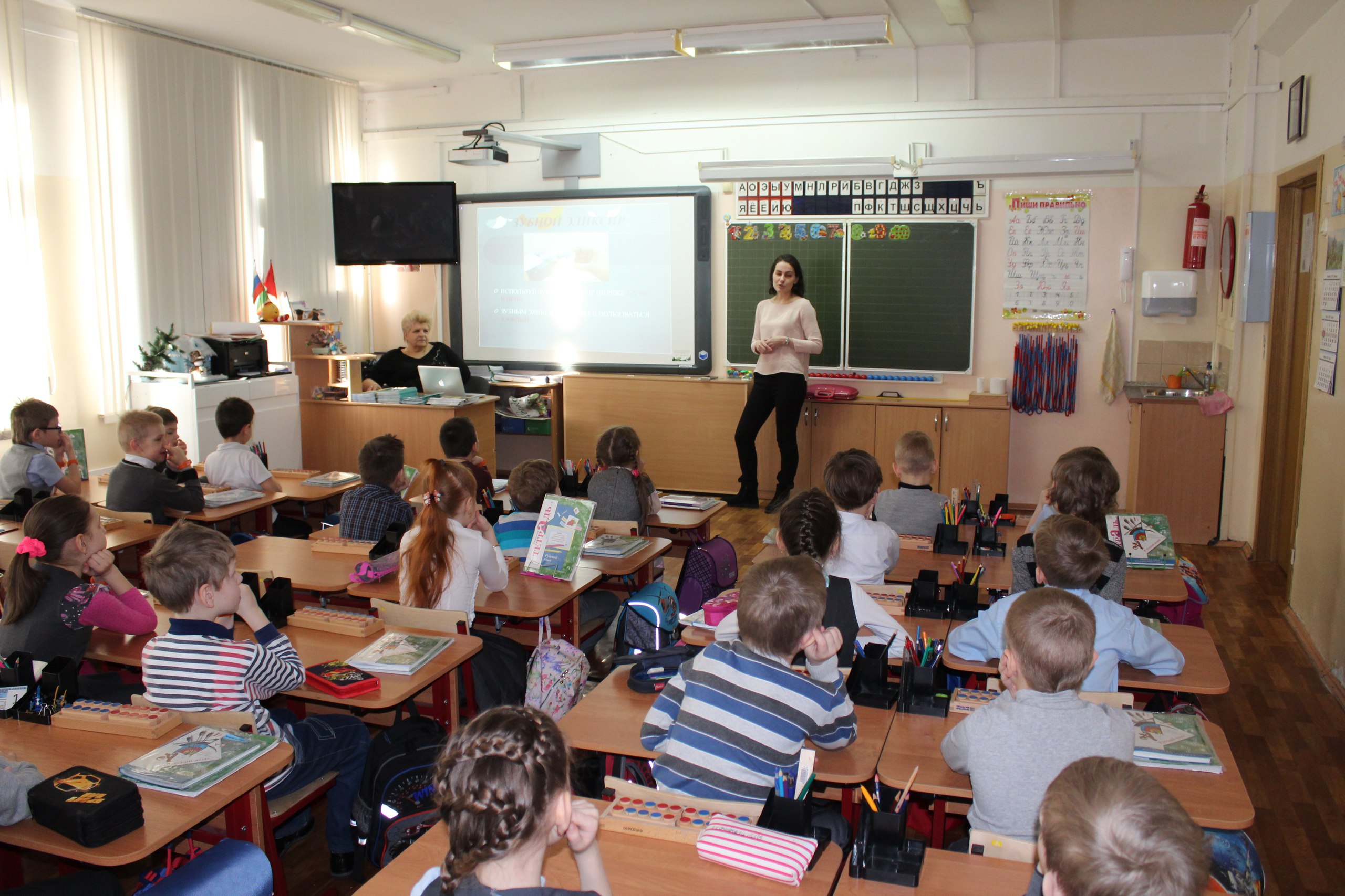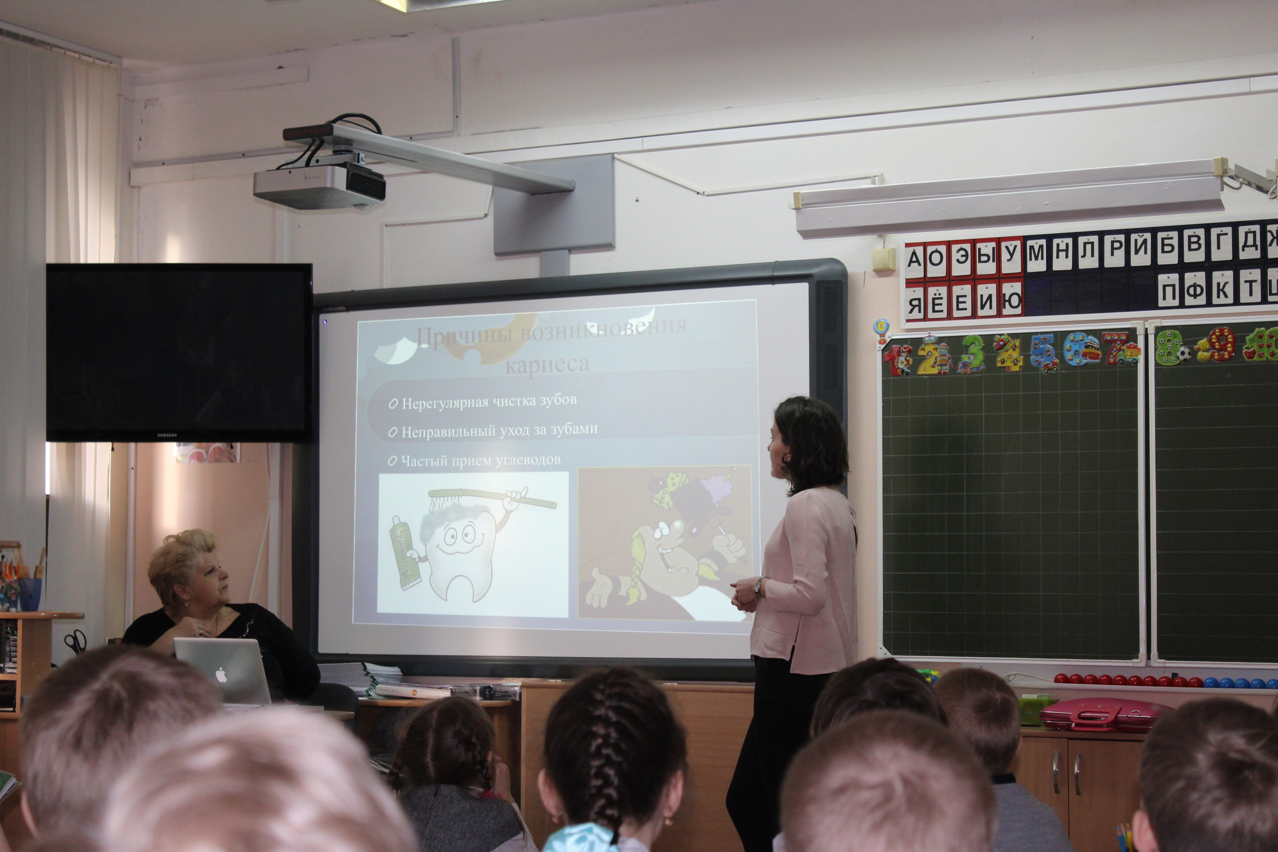 Там уже прошел первый урок, на котором школьники узнали от врачей о строении зубов, об уходе за полостью рта и средствах гигиены, о причинах возникновения кариеса, а также получили ответы на другие вопросы.