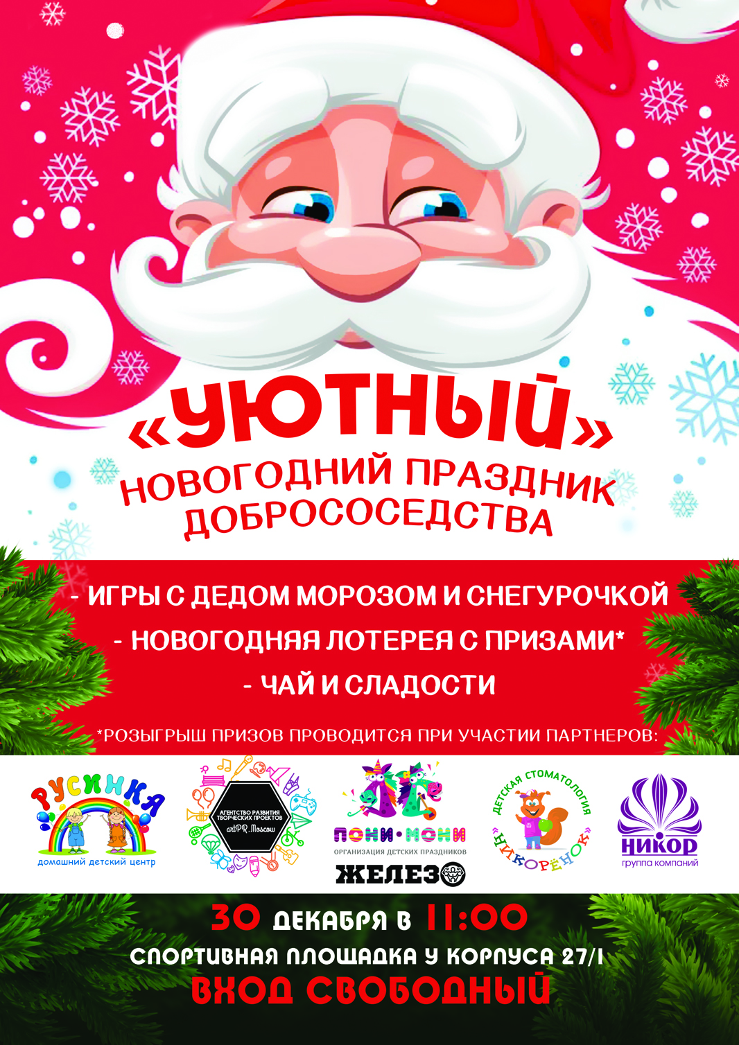 Вас ждет новогодняя лотерея с призами (в том числе от Никорёнка и мед.ценра «Никор-Мед»), чай, сладости, и конечно же, веселые игры с Дедом Морозом и Снегурочкой!