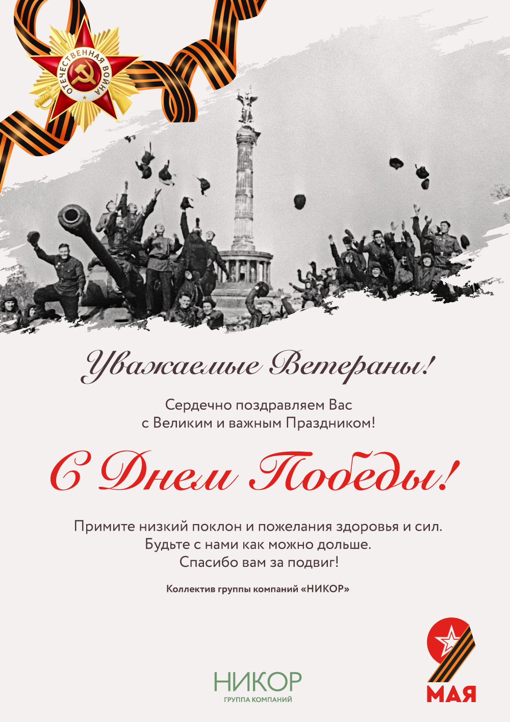 Уважаемые ветераны! Сердечно поздравляем Вас с Великим и важным Праздником! С Днем Победы! Примите низкий поклон и пожелания здоровья и сил. Будьте с нами как можно дольше. Спасибо вам за подвиг! Коллектив группы компаний «Никор»