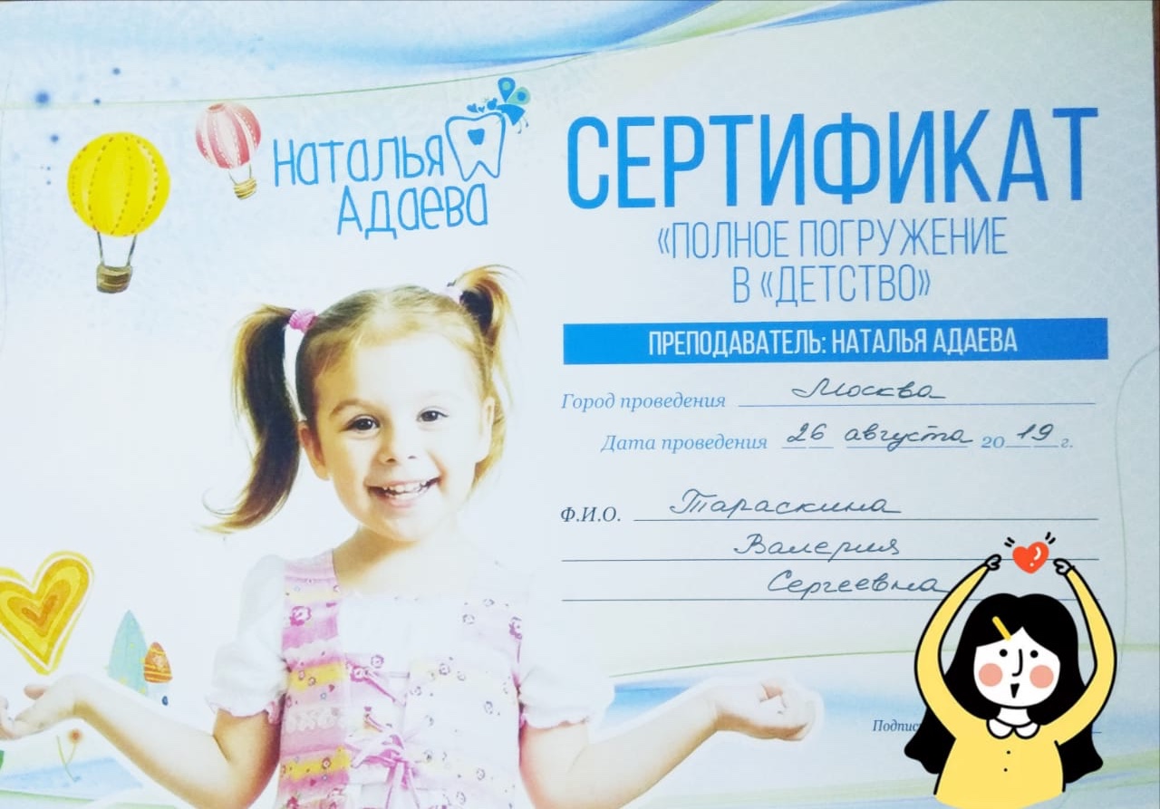 Врачам обязательно нужно продолжать усовершенствовать свои навыки и улучшать свои знания. В этот раз, наш детский врач-стоматолог Тараскина Валерия Сергеевна прошла обучение по программе «Полное погружение в детство» у преподавателя Натальи Адаевой.