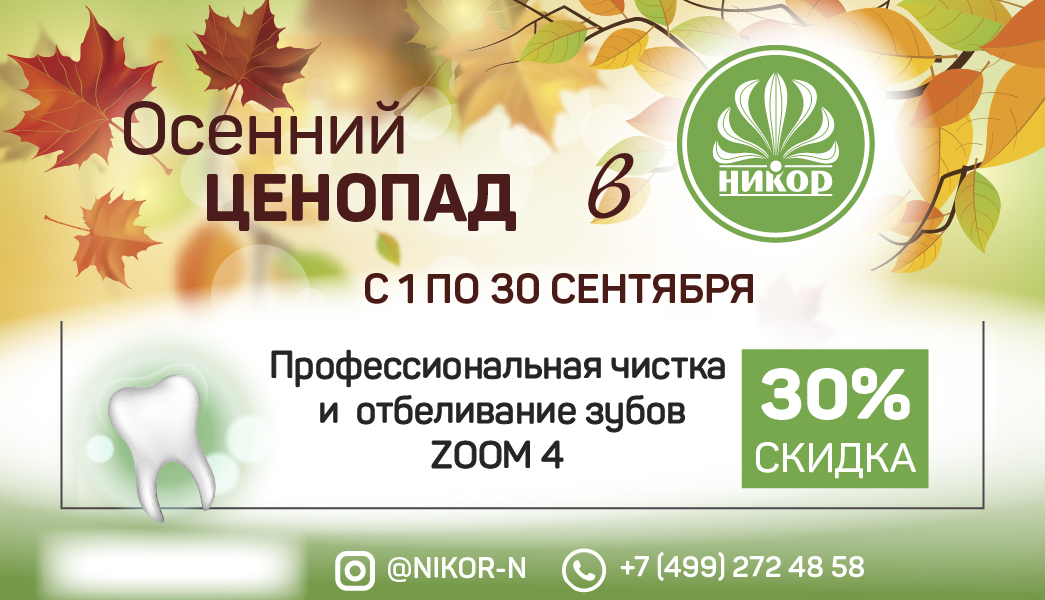 Отбеливают зубы в корпусах клиниках «Никор» в корпусах 250, 1004, 1204 и 1825. Весь сентябрь на профессиональную чистку зубов действует скидка 30%.