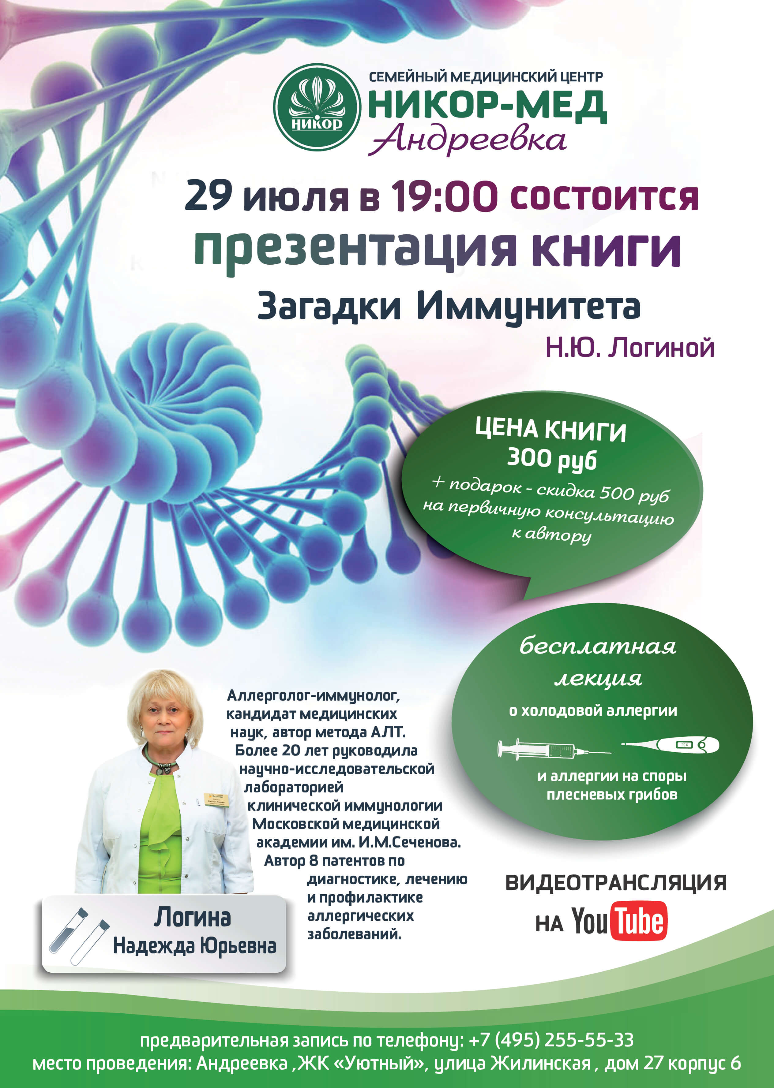 Боритесь с аллергией? Плохой иммунитет? Рады сообщить: 29 июля в 19:00 состоится презентация книги «Загадки Иммунитета» Надежды Юрьевны Логиной, а после, совершенно бесплатно, врач прочтет лекцию о сезонных видах аллергии.Надежда Юрьевна — аллерголог-иммунолог, кандидат медицинских наук, автор метода АЛТ, более 20 лет руководила научно-исследовательской лабораторией клинической иммунологии Московской медицинской академии им. И. М. Сеченова. Автор 8 патентов по диагностике,лечению и профилактике аллергических заболеваний.